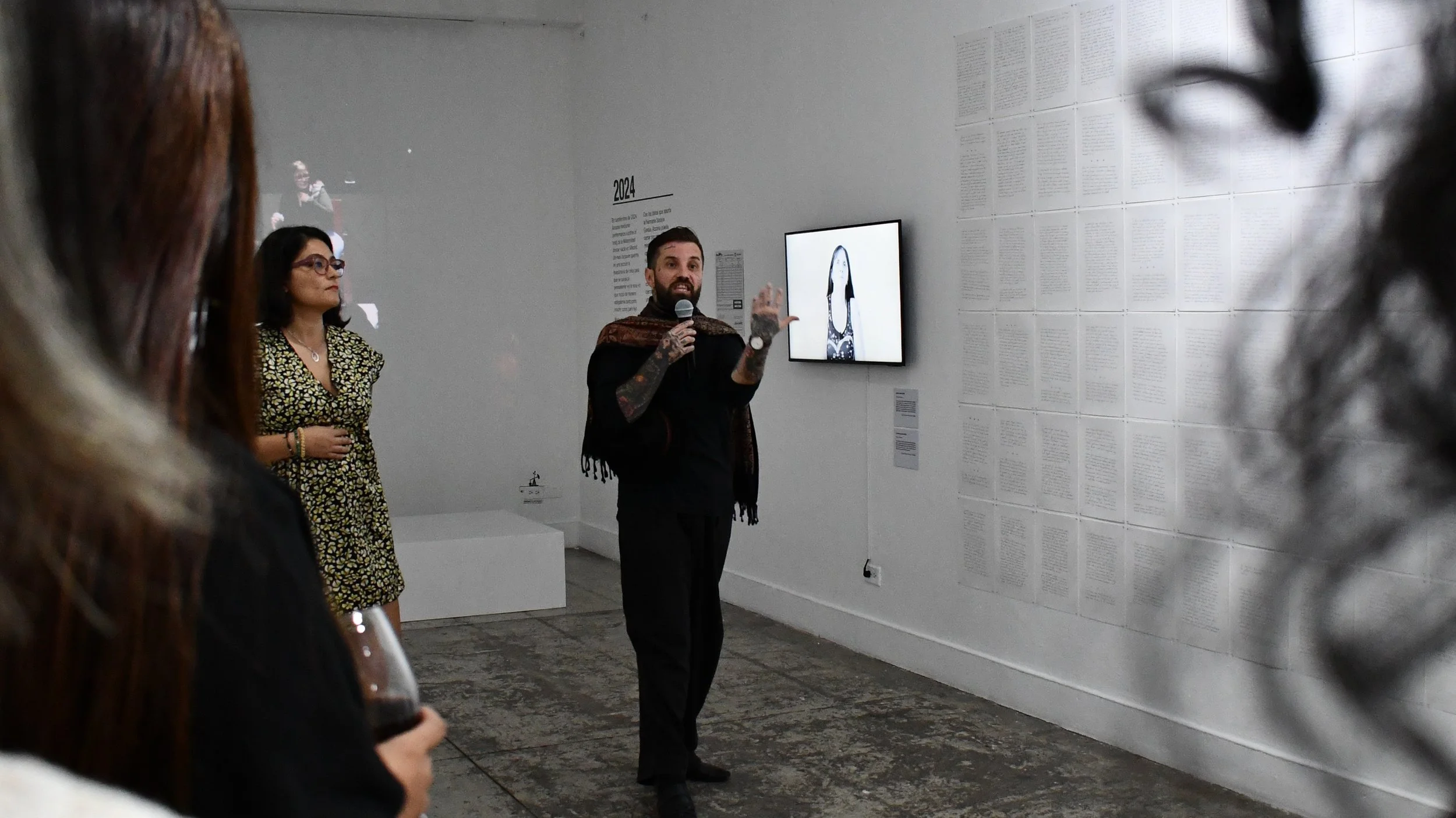Performance within the exhibition My Families 1988–2024 at La Panera Art Center in Lleida. During the action, Azcona receives DNA test results confirming Isabel Gómez Aranda’s maternity at 99.99997%. The artist calls his mother live to share the result.