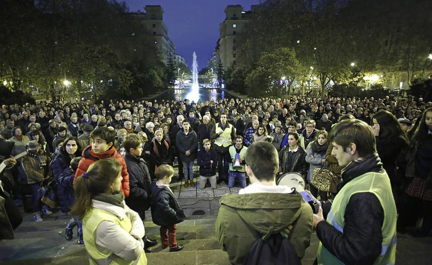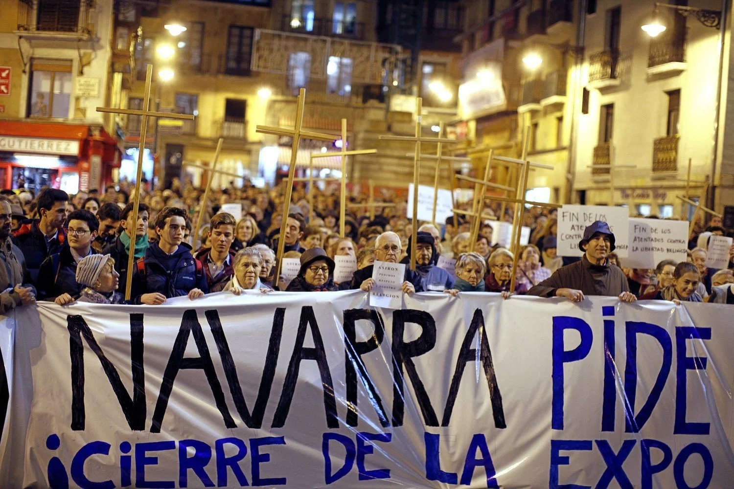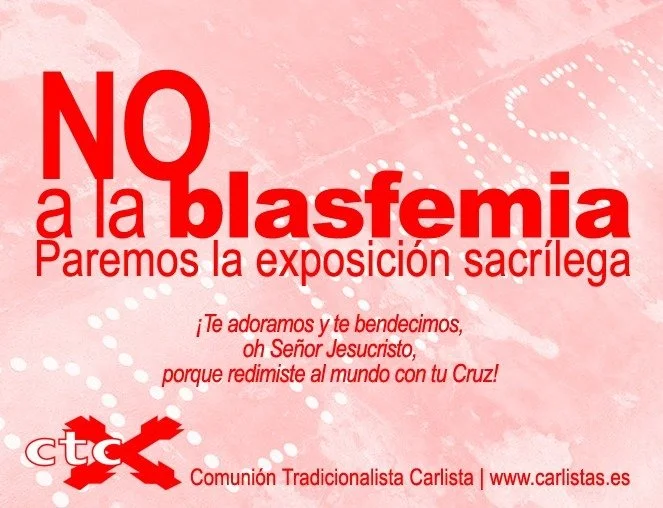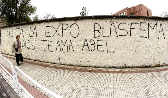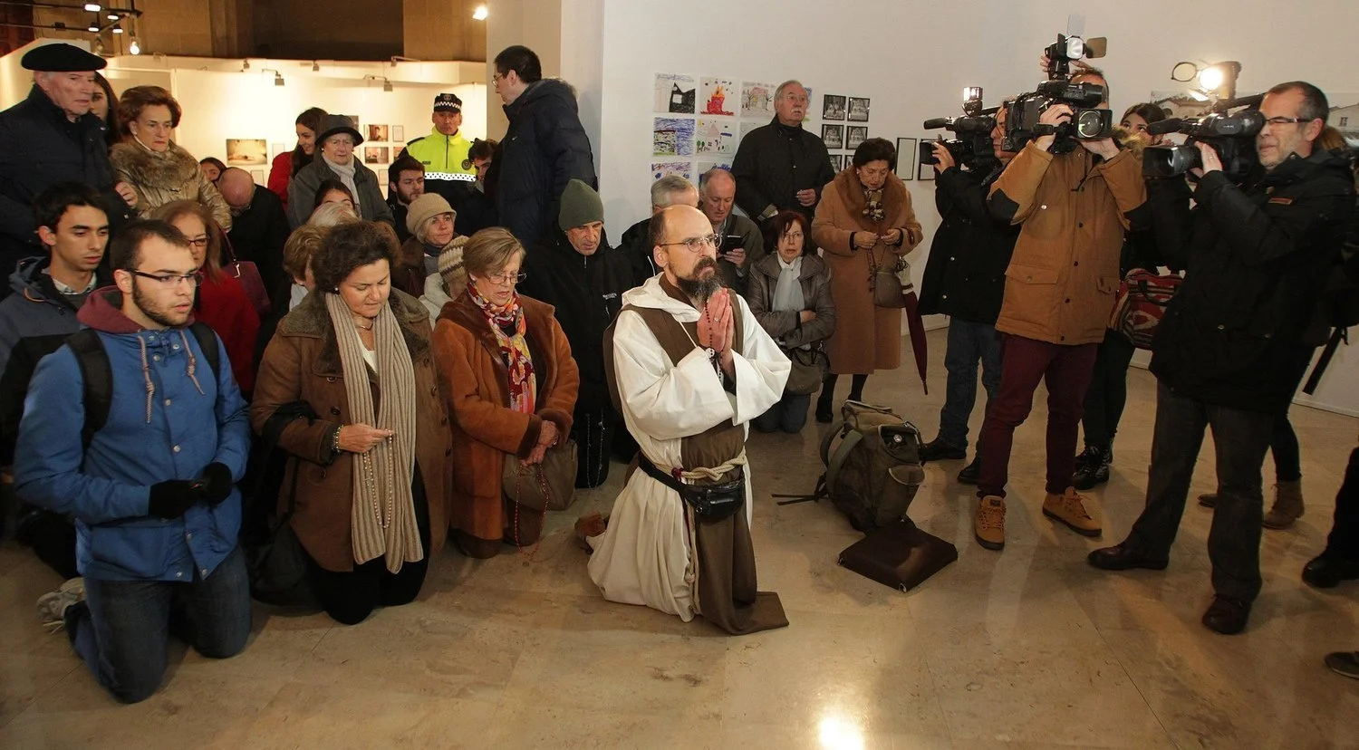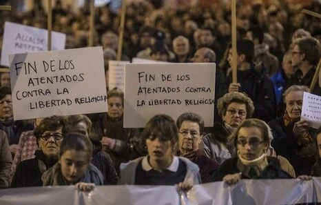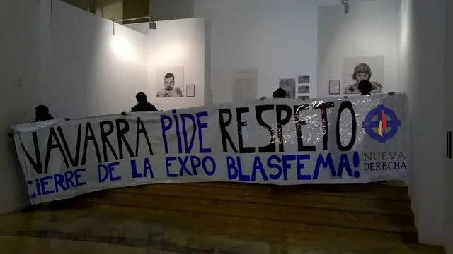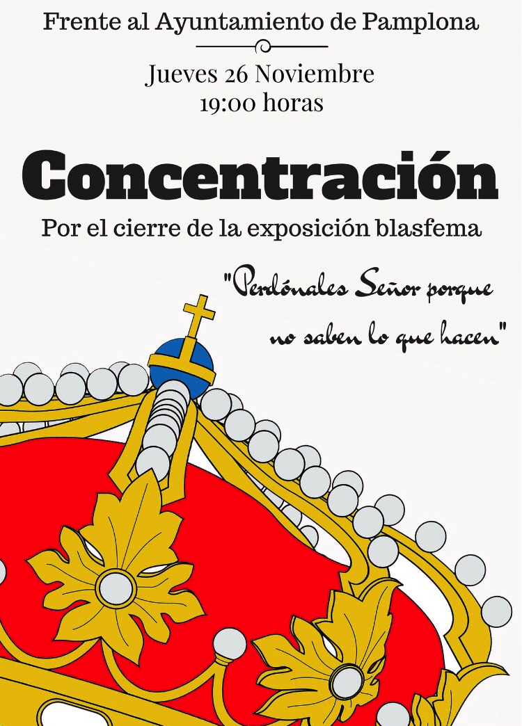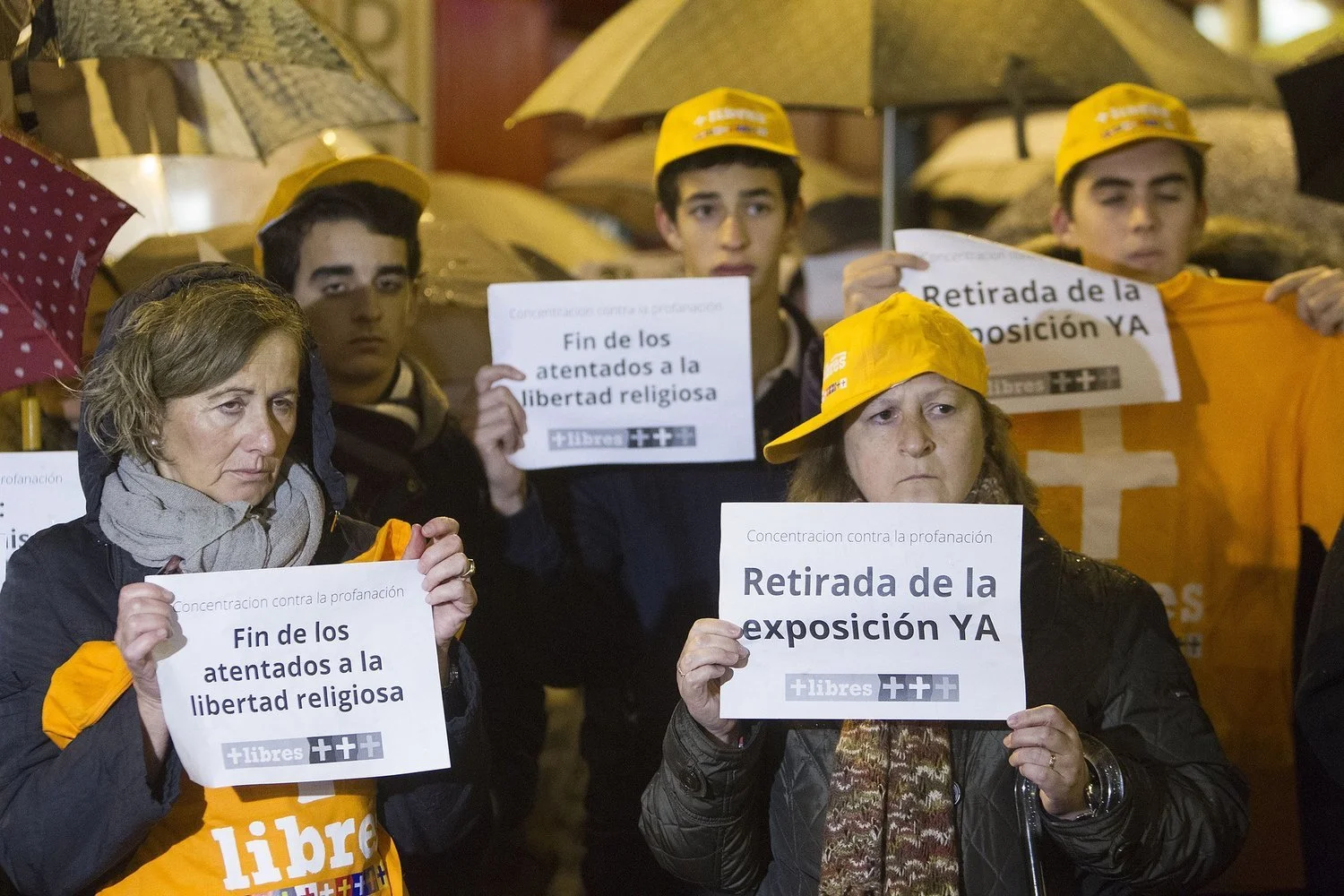 November 22, 2015. Respect for Navarra, the Carlist Traditionalist Union, Hazte Oír and Más Libres called the first concentration against the exhibition and against Azcona in the Town Hall Square of Pamplona. About nine hundred people shouted "Azcona, God forgives you" or "We are going to close that exhibition."