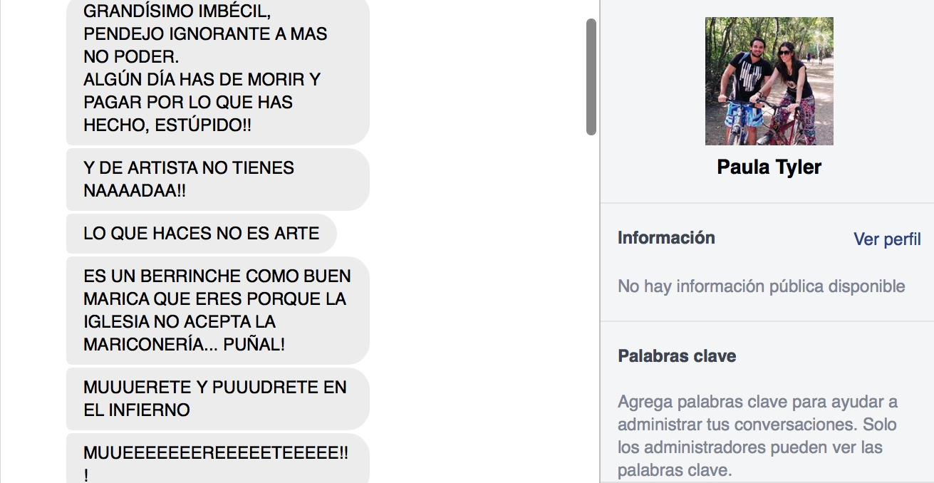November 28, 2015. Azcona had to leave the exhibition building and was advised not to approach without escort because a man showed up with a firearm, shouting proclamations and threatening the artist with death.