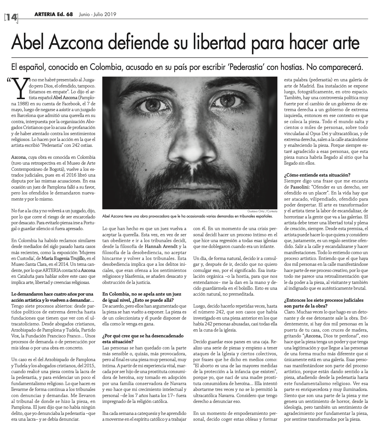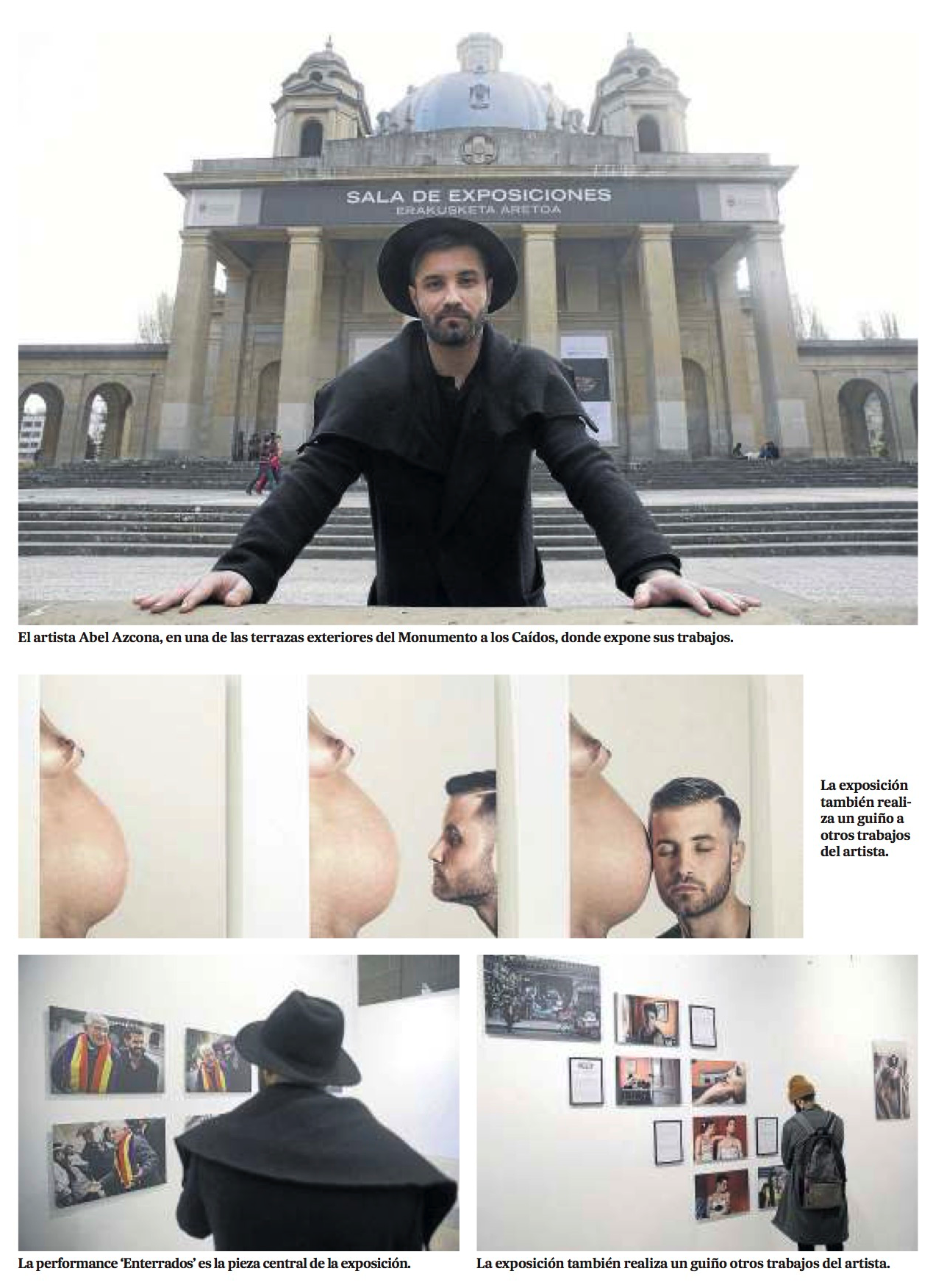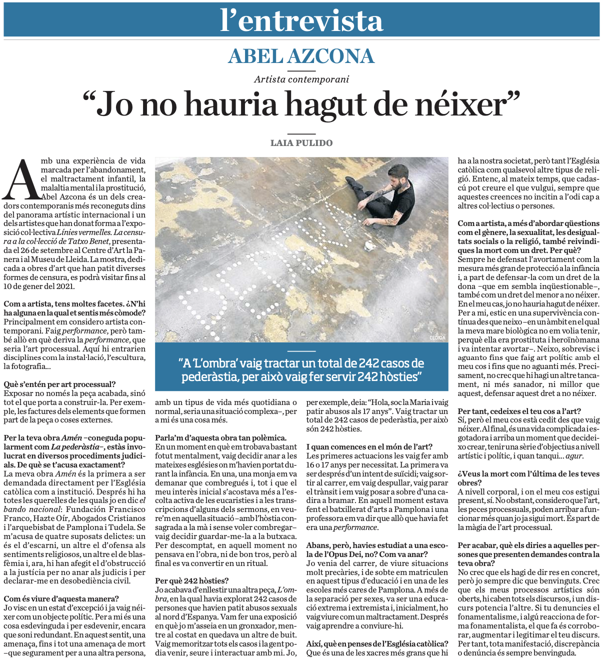 “En noviembre de 2015 la existencia de Abel Azcona se hizo visible y se tornó perpetua. Asistió a 242 eucaristías y con las hostias hizo la palabra “pederastia”. Una parte de Pamplona se movilizó contra el artista por la exposición de su acción y la Asociación Española de Abogados Cristianos presentó una querella contra él por “profanación”. Es un artista sin medida, ni medias tintas. Utiliza la performance fusionada con el videoarte, la instalación o la escultura para indagar en derechos humanos, injusticias sociales, abuso, maltrato, desigualdad, política, terrorismo, religión y se ha especializado en la lapidación pública. No reniega de ella, sino que la incluye en sus acciones. La reacción es parte esencial.”