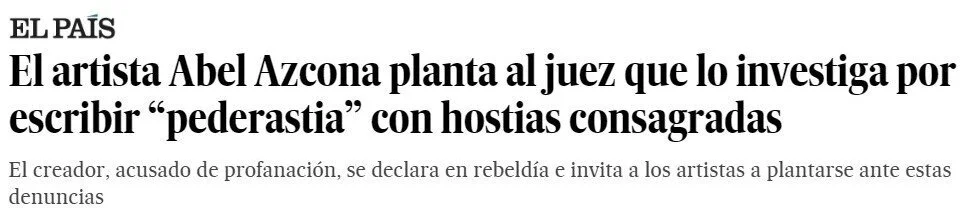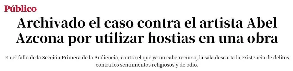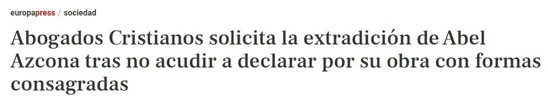 9 de octubre de 2019. El Tribunal de Estrasburgo admite la demanda contra el artista Abel Azcona. La Asociación Española de Abogados Cristianos denunció a España por la obra 'Amén' del artista Abel Azcona, que considera "la mayor profanación de la historia".
