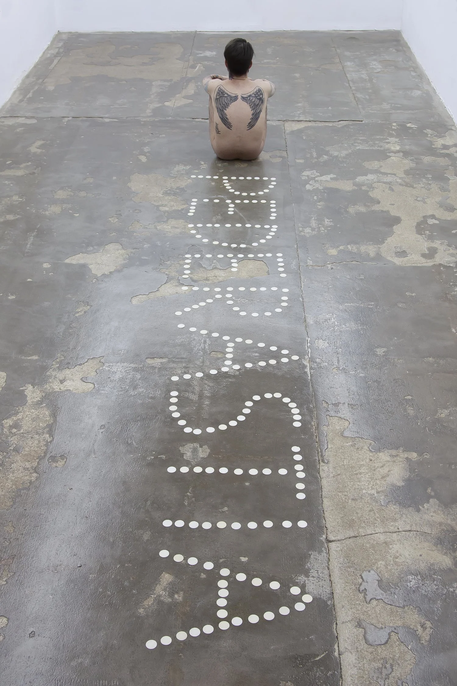 En el ejercicio de improvisación performativo, Azcona crea una instalación orgánica donde puede leerse la palabra “pederastia”. Dicha instalación permaneció durante dos días para poder ser visitada en la galería de arte del Barrio de las Letras madrileño. Varios visitantes interaccionaron con la pieza y la obra fue valorada por la crítica como necesaria, resiliente y coherente. La performance fue documentada mediante fotografía y vídeo, sin idea de ser reactivada.