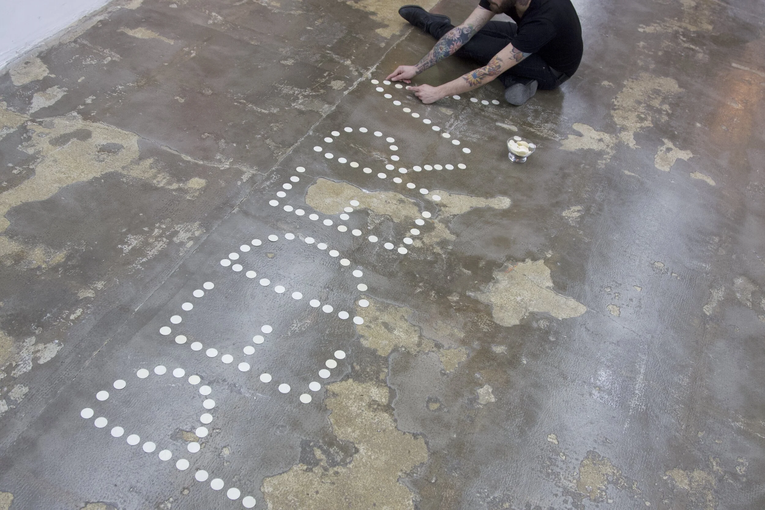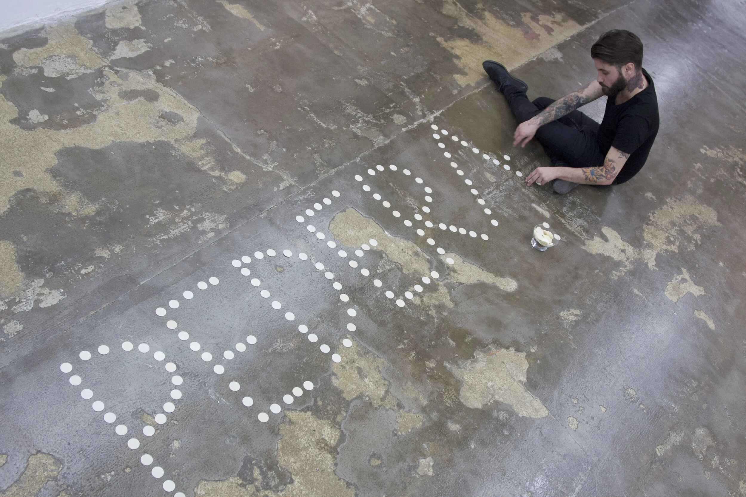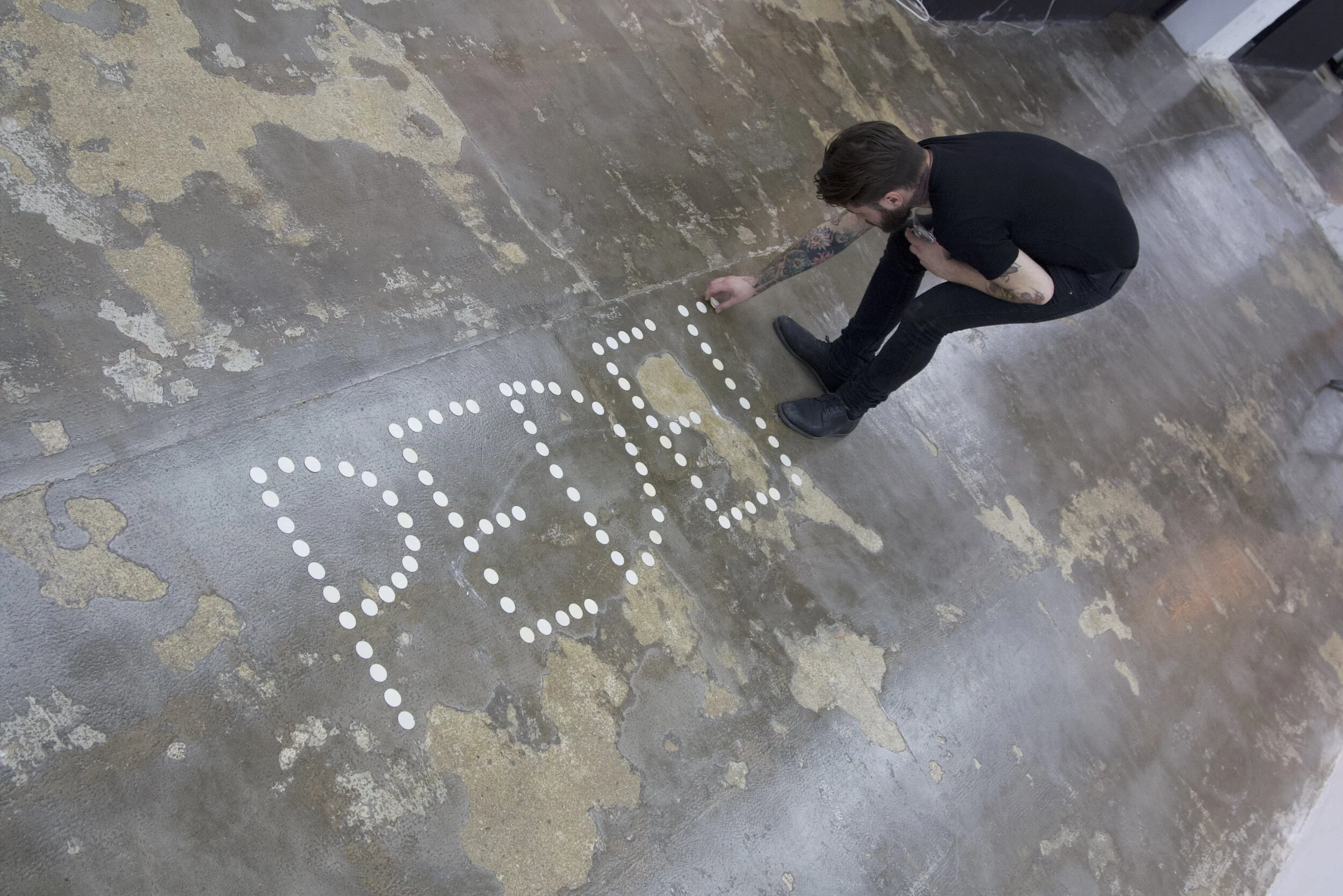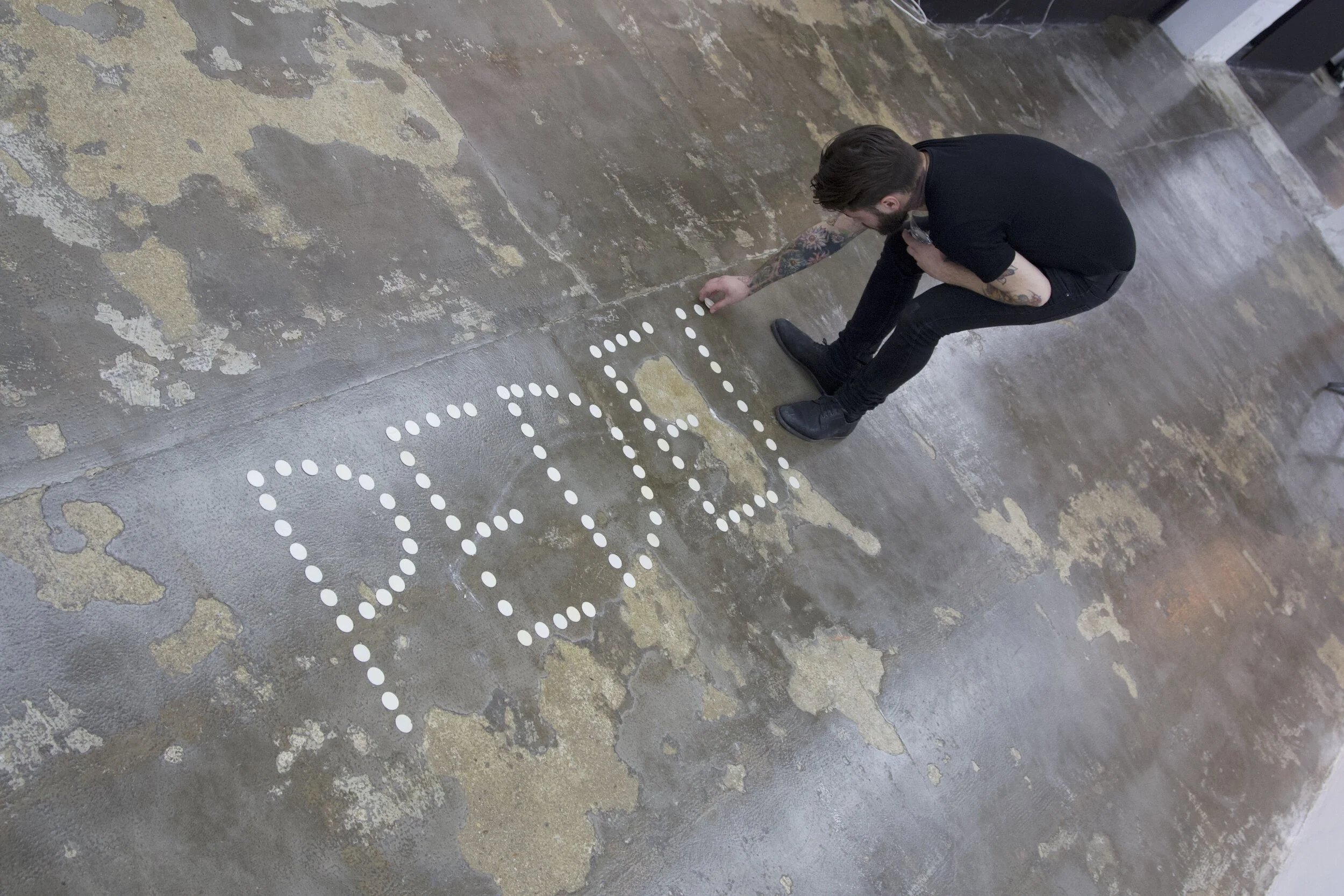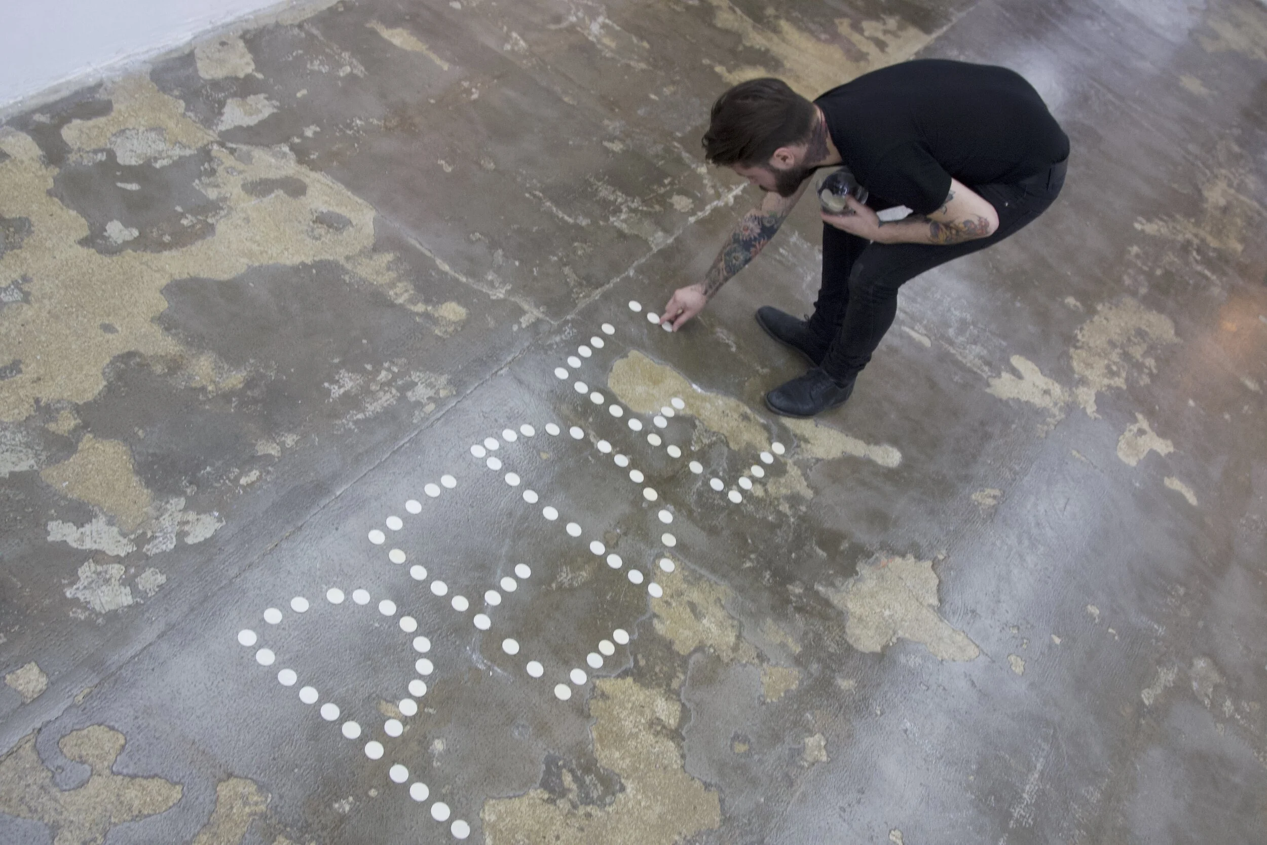El artista Abel Azcona durante la construcción de la instalación en Konvent Contemporary Art Center. Fotografía Jordi Plana.