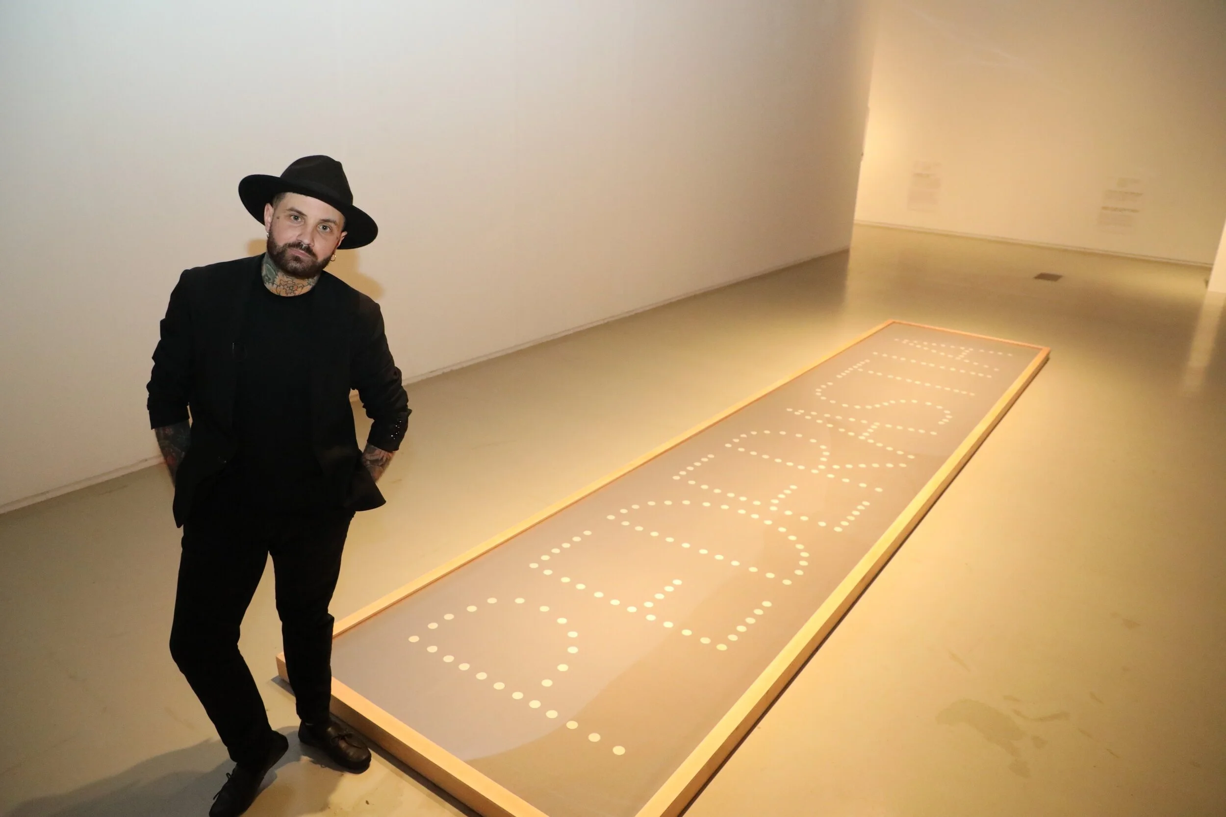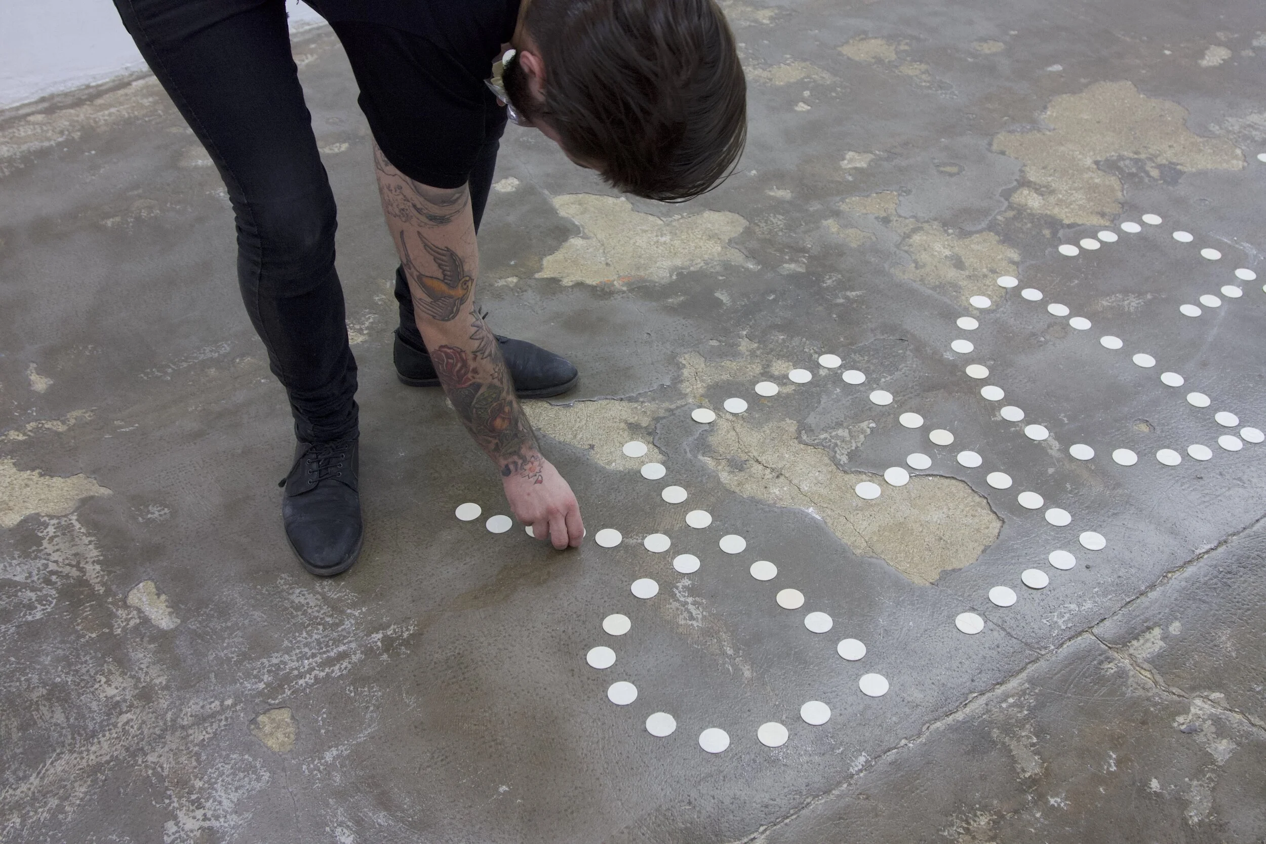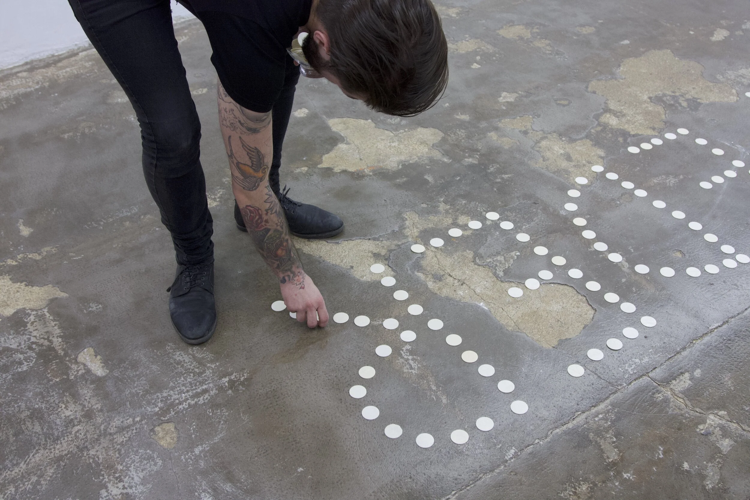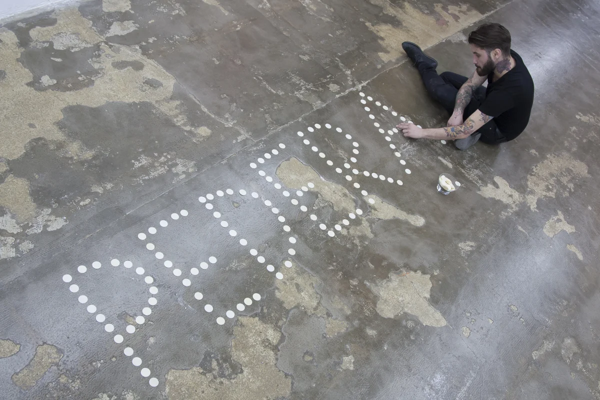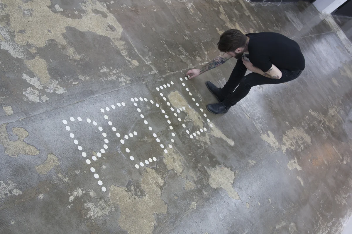 El artista Abel Azcona durante la construcción de la instalación en Konvent Contemporary Art Center. Fotografía Jordi Plana.