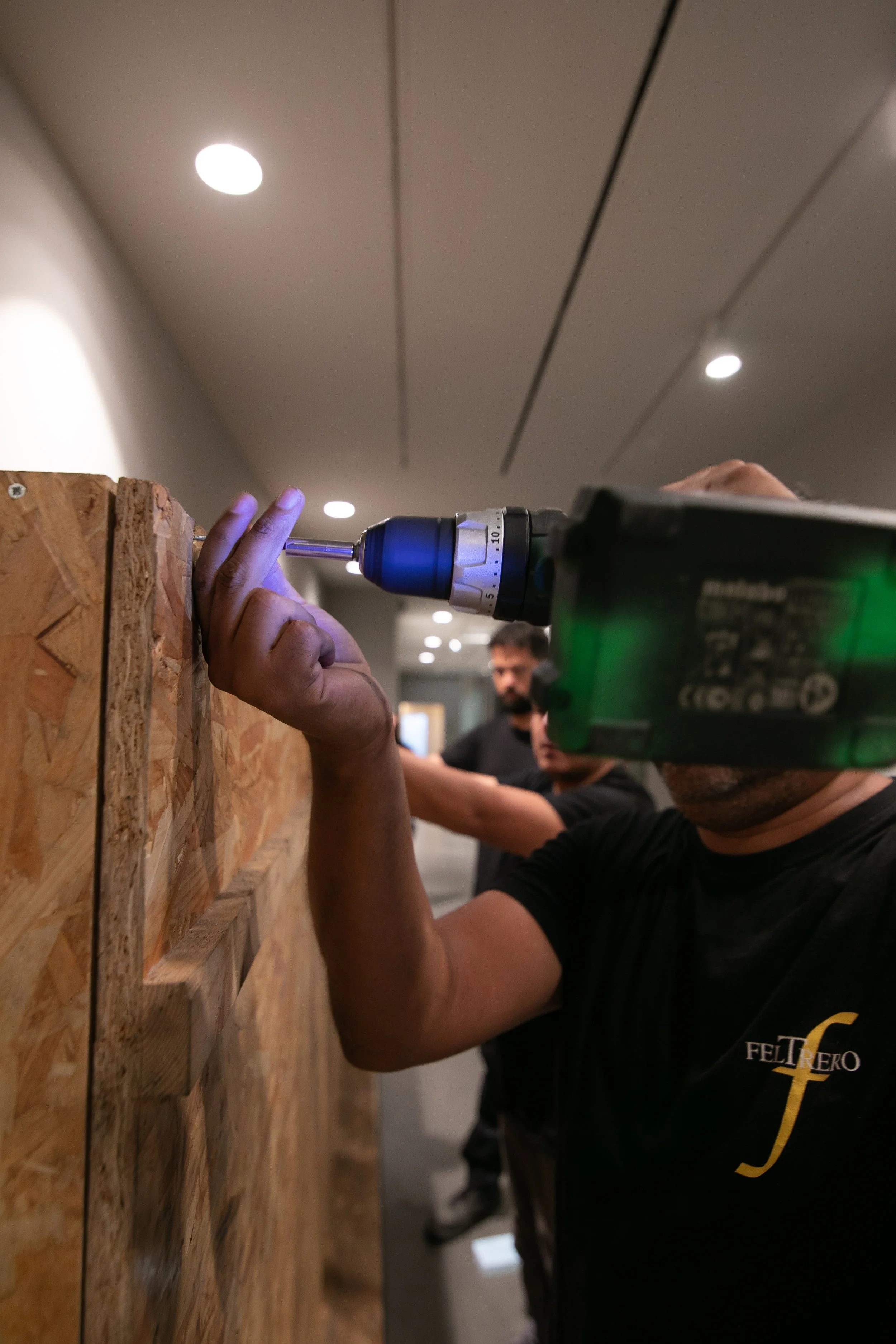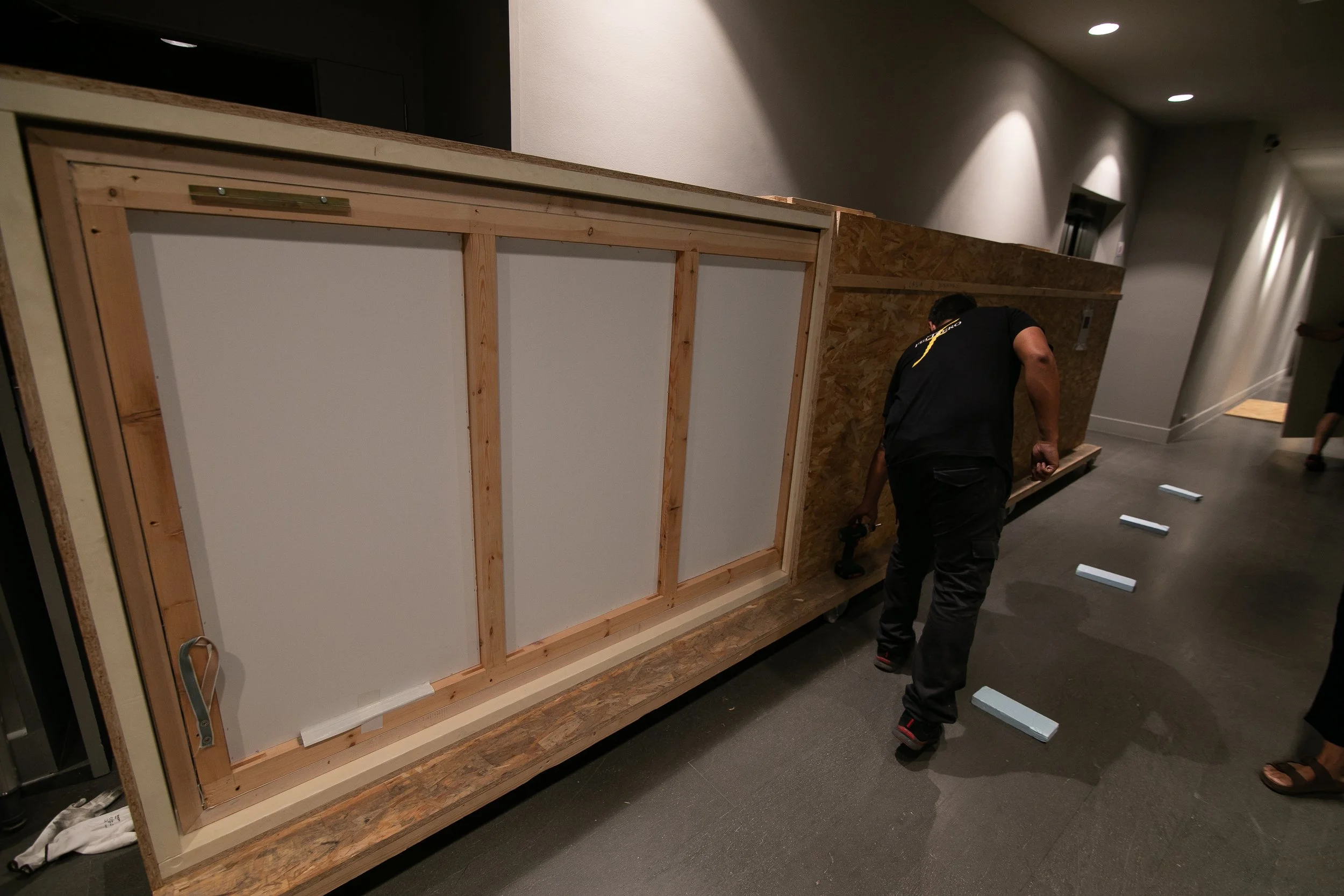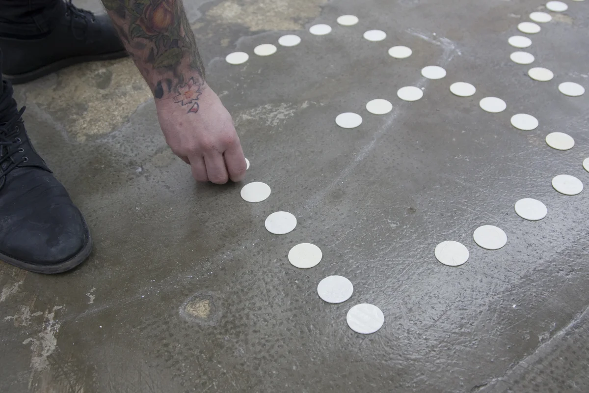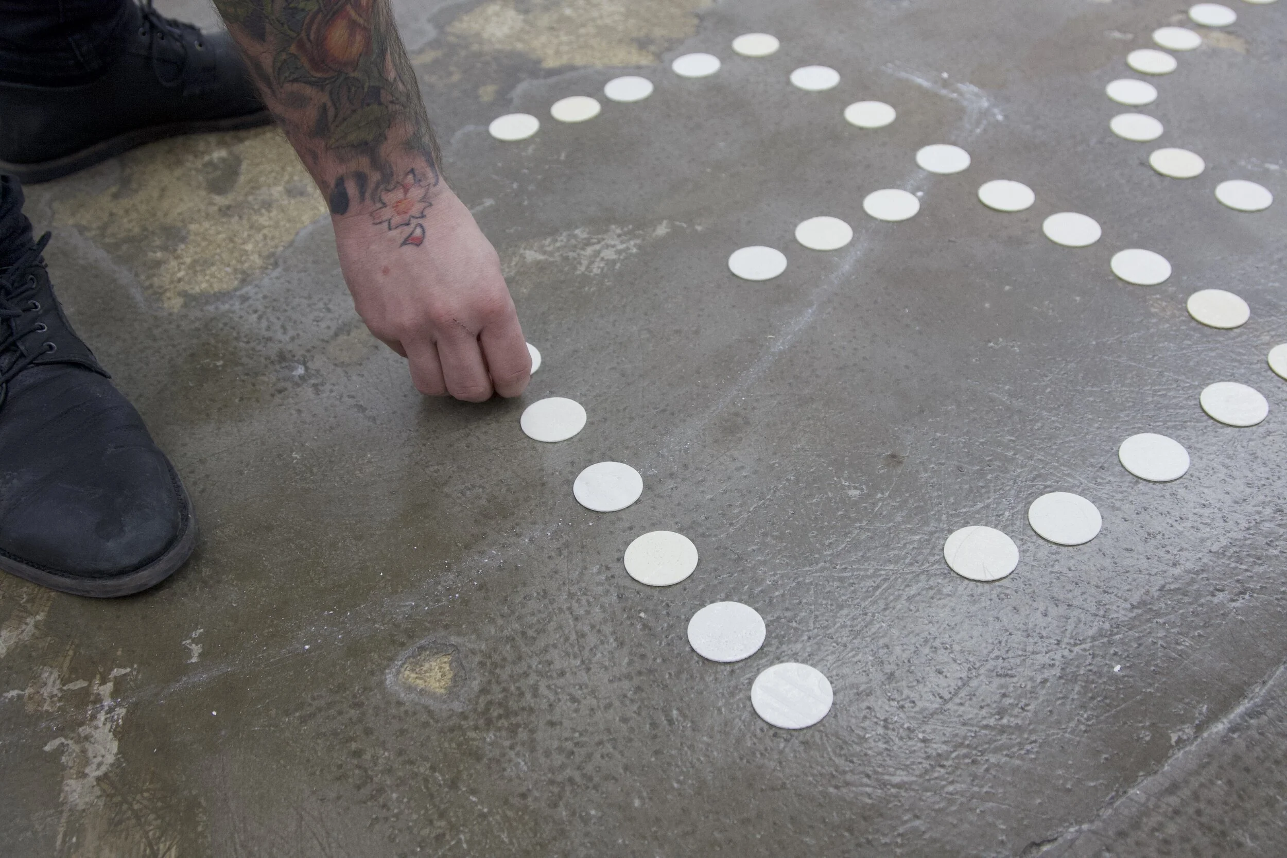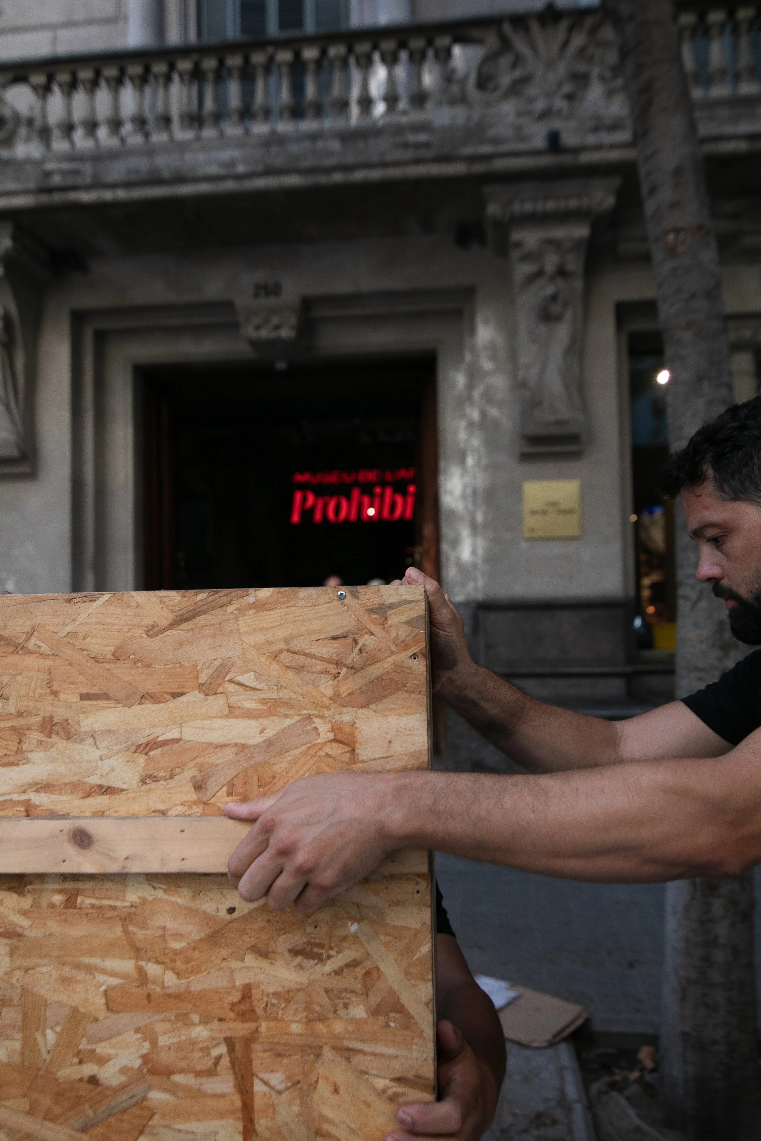 El artista Abel Azcona durante la construcción de la instalación en Konvent Contemporary Art Center. Fotografía Jordi Plana.
