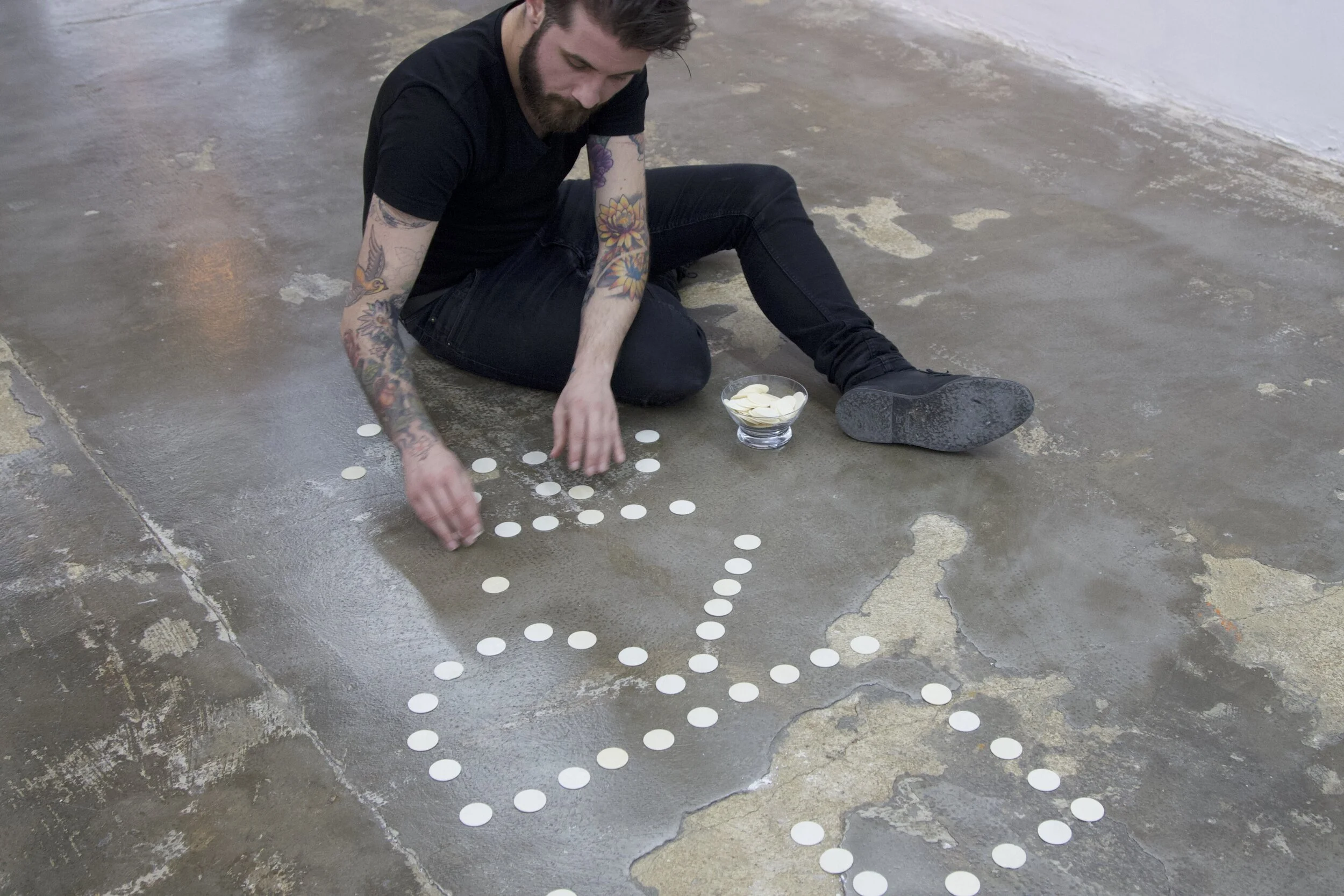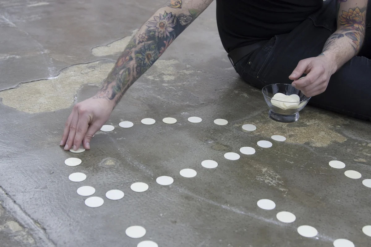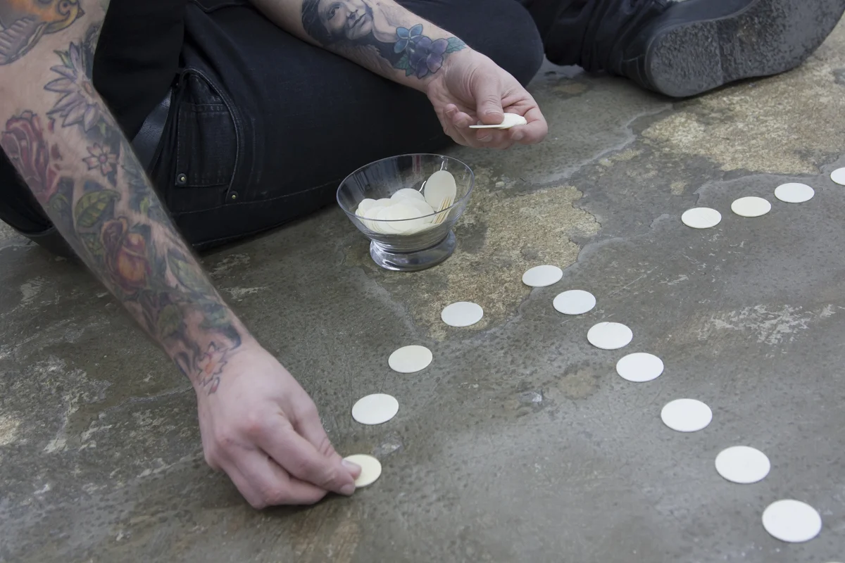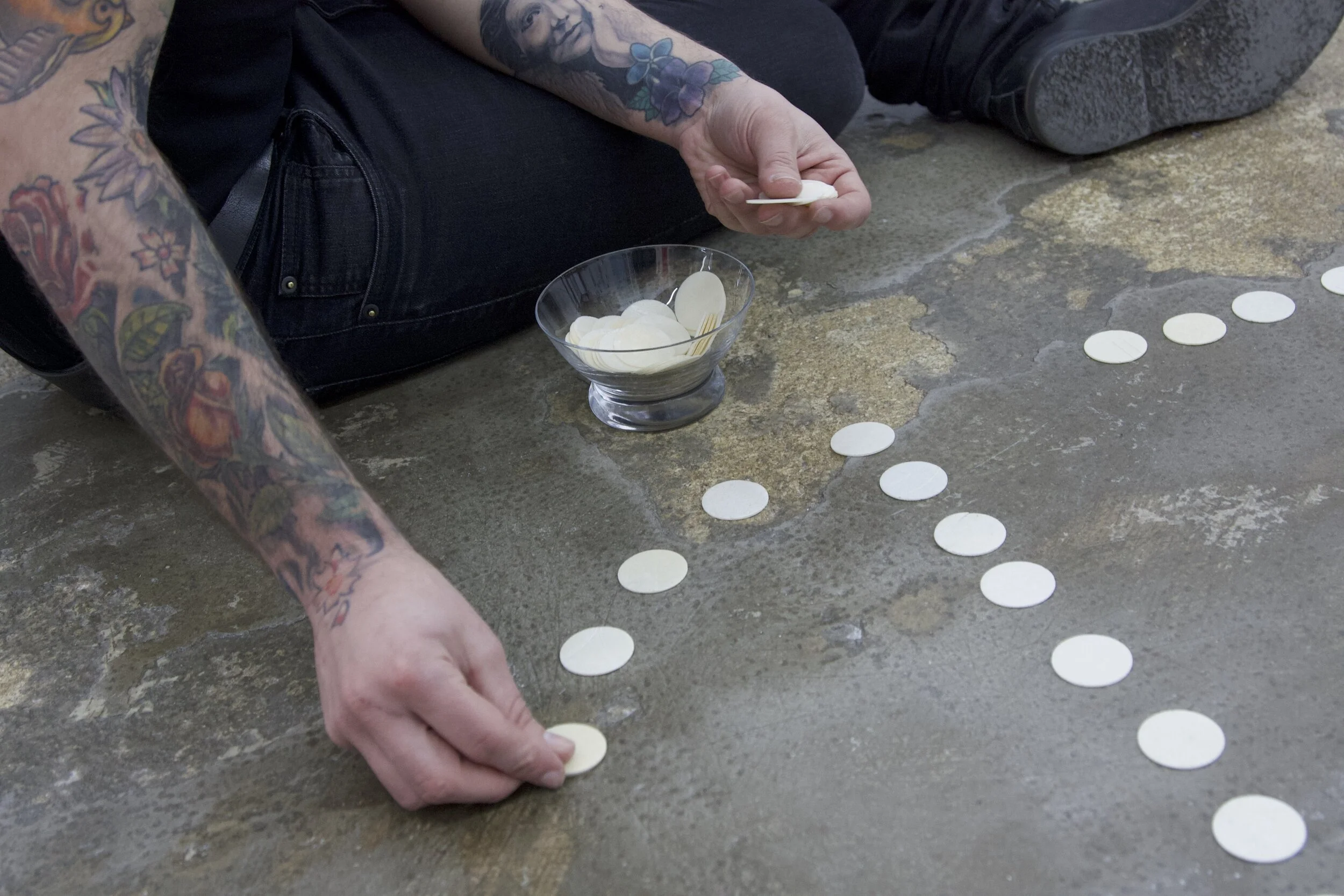 The second week of September 2015, within the context of an exhibition with a wide selection of works and performances by the artist in a Madrid gallery, Azcona carried out a series of newly created performances and installations. Among them and open to the public, Azcona activated and intervened the more than 250 wafers collected during that same summer in churches and parishes in the cities of Pamplona and Madrid. In the exercise of performative improvisation, Azcona created an organic installation where the word "pederasty" could be read.