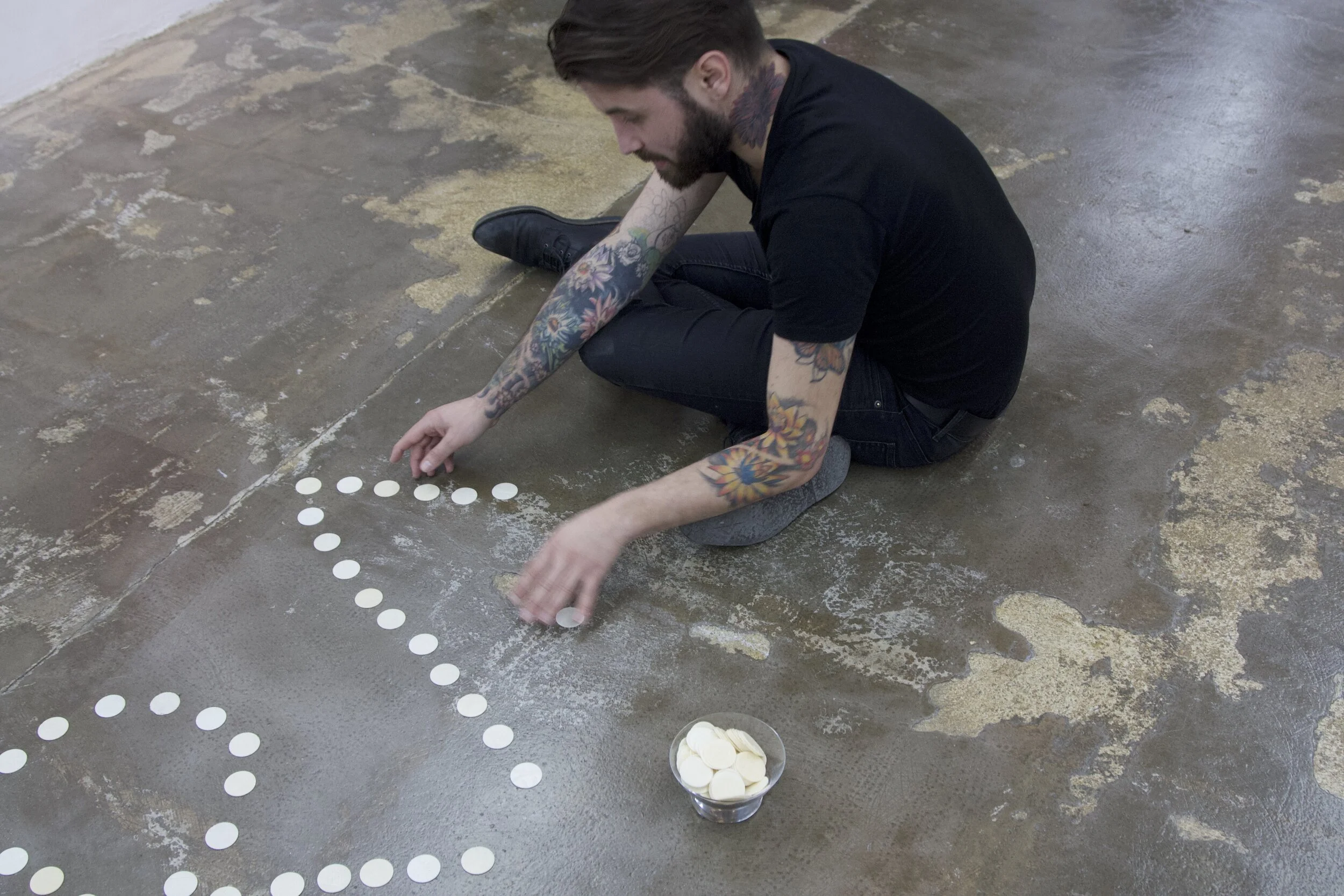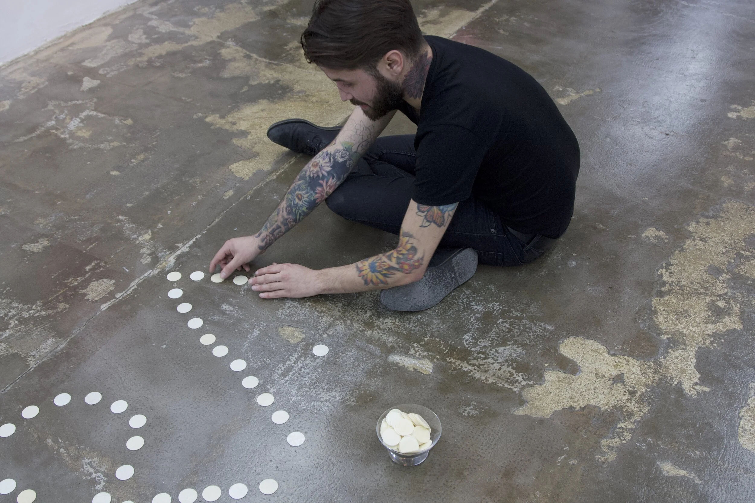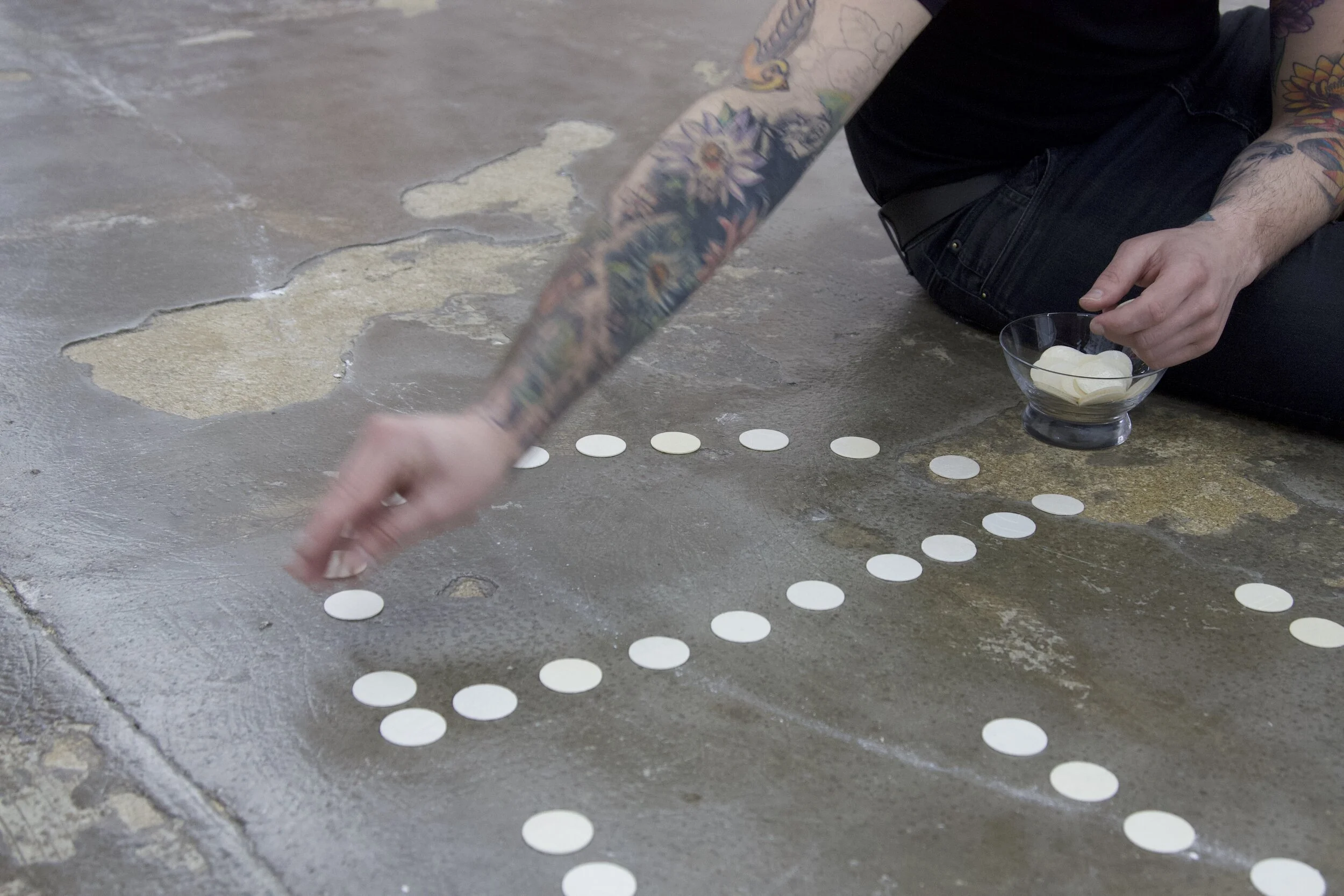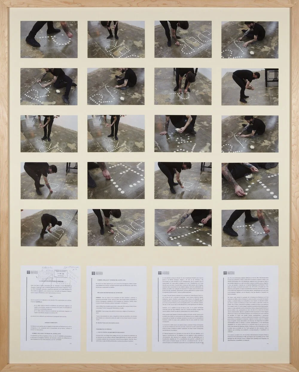 The second week of September 2015, within the context of an exhibition with a wide selection of works and performances by the artist in a Madrid gallery, Azcona carried out a series of newly created performances and installations. Among them and open to the public, Azcona activated and intervened the more than 250 wafers collected during that same summer in churches and parishes in the cities of Pamplona and Madrid. In the exercise of performative improvisation, Azcona created an organic installation where the word "pederasty" could be read.