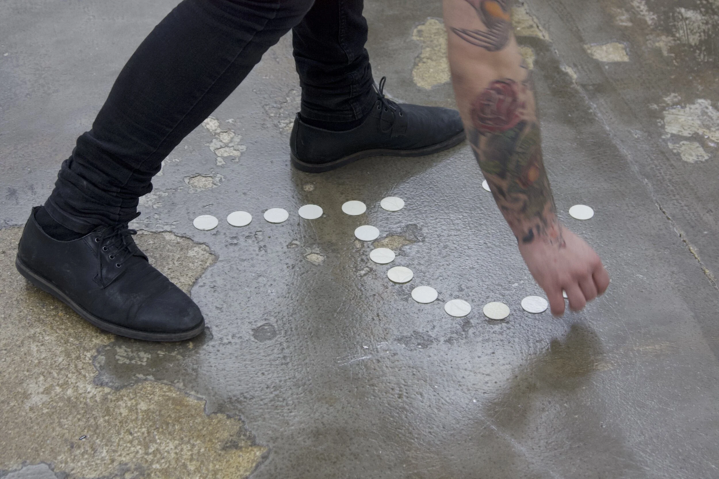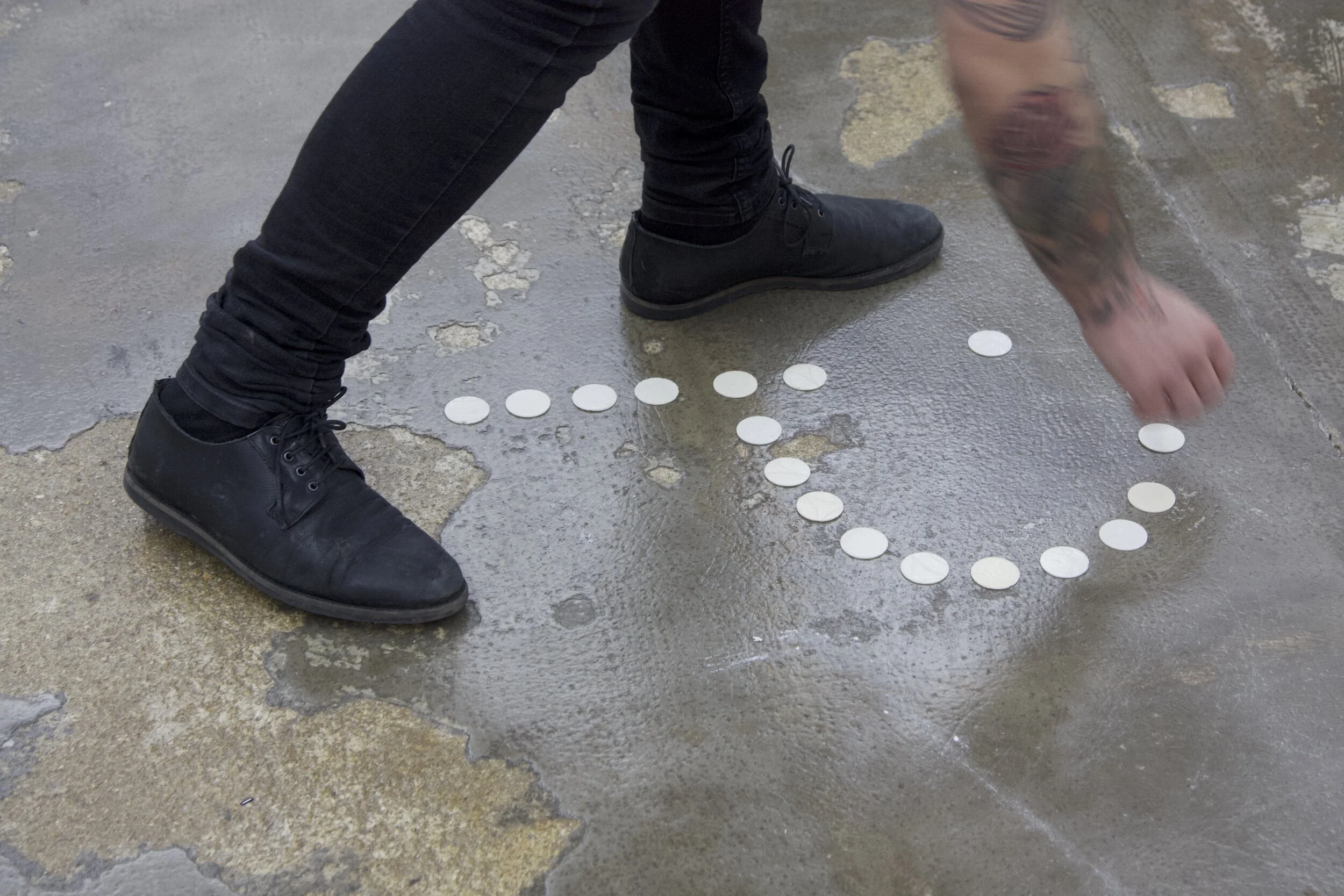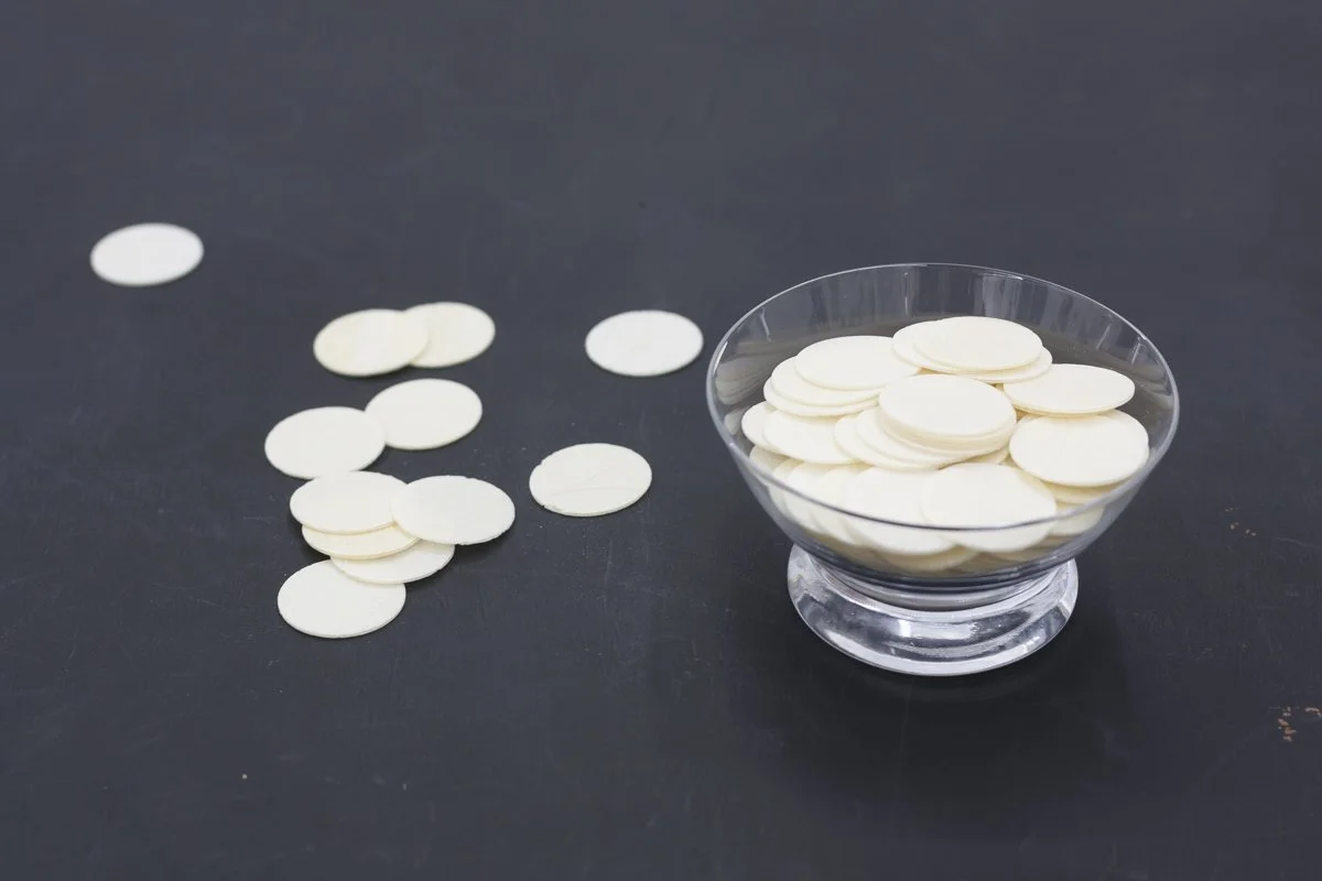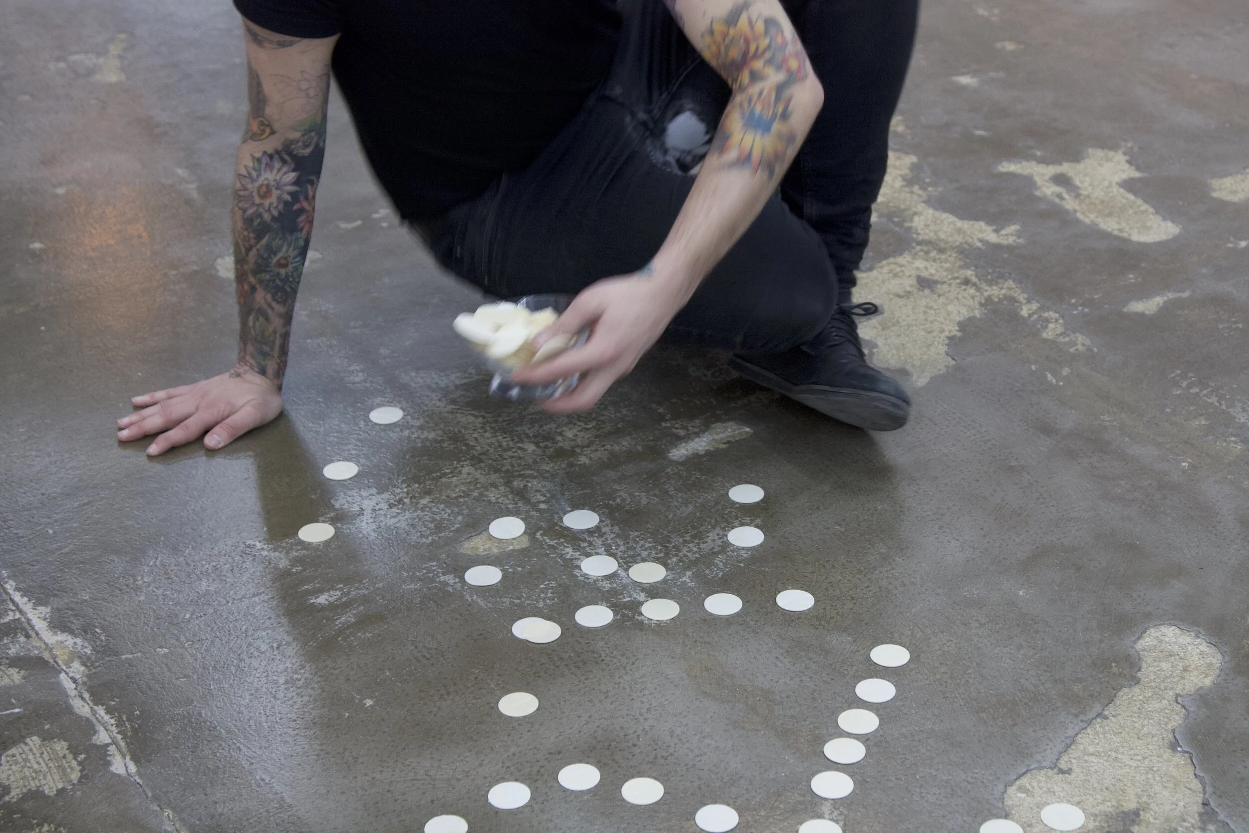 The second week of September 2015, within the context of an exhibition with a wide selection of works and performances by the artist in a Madrid gallery, Azcona carried out a series of newly created performances and installations. Among them and open to the public, Azcona activated and intervened the more than 250 wafers collected during that same summer in churches and parishes in the cities of Pamplona and Madrid. In the exercise of performative improvisation, Azcona created an organic installation where the word "pederasty" could be read.