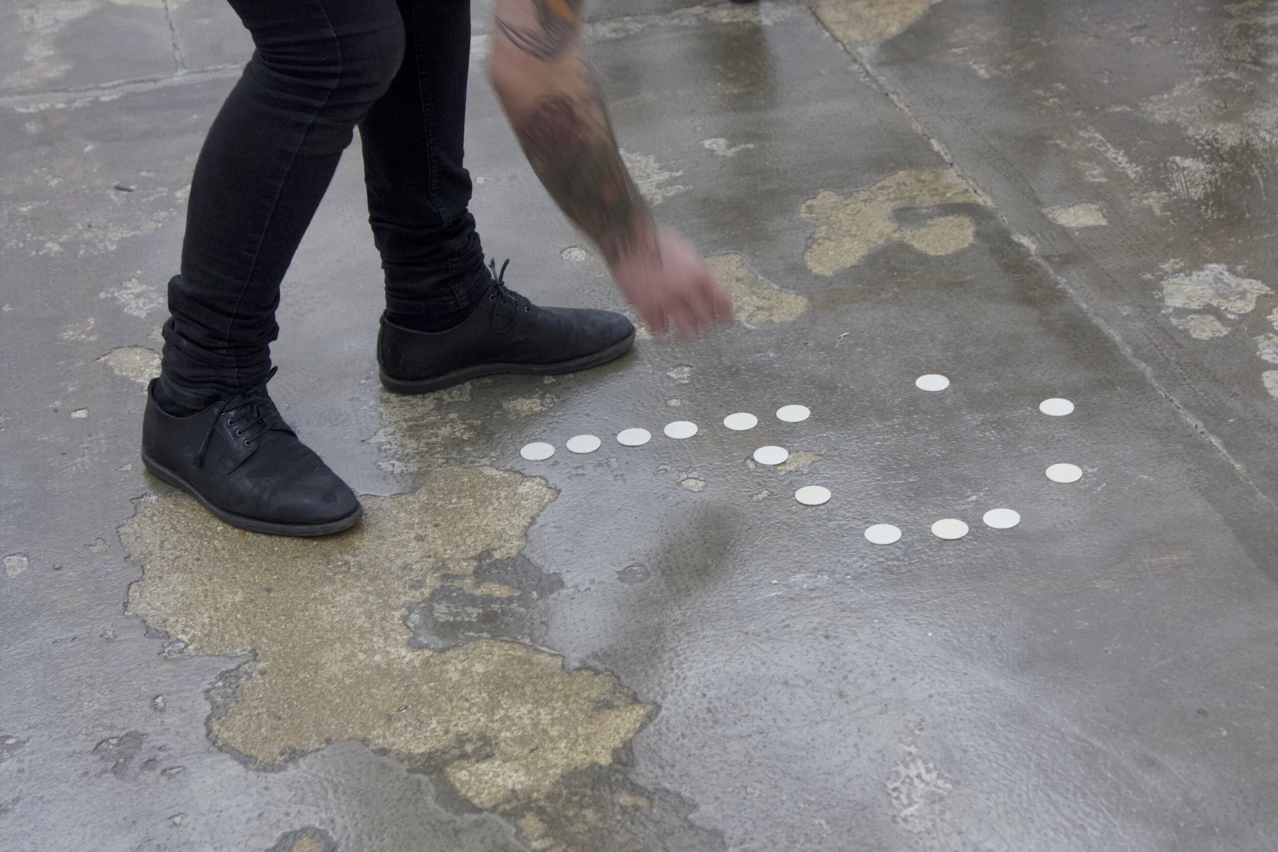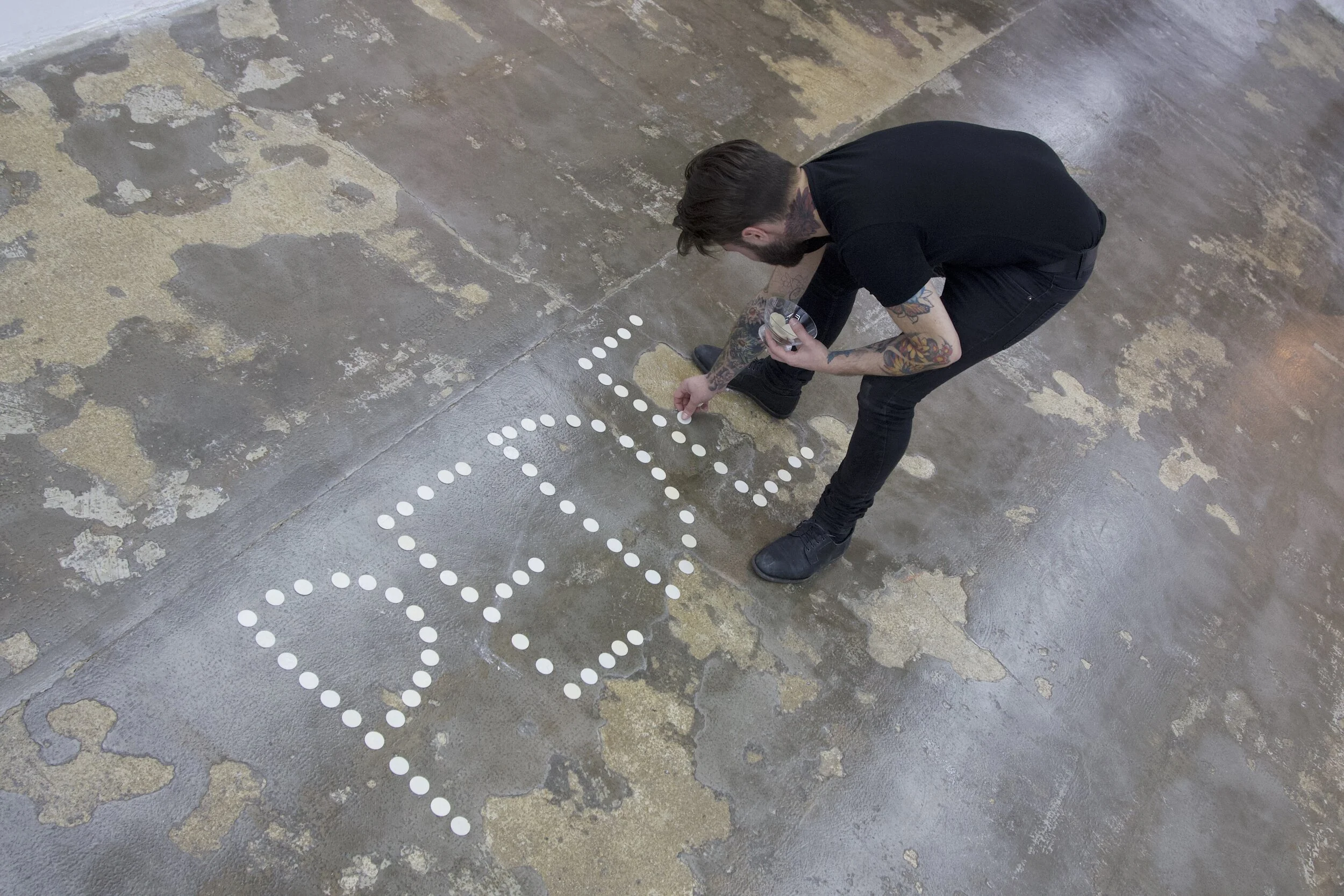 Performance inicial donde el artista Abel Azcona realiza la instalación en Galería Alicia Hevia de Madrid.