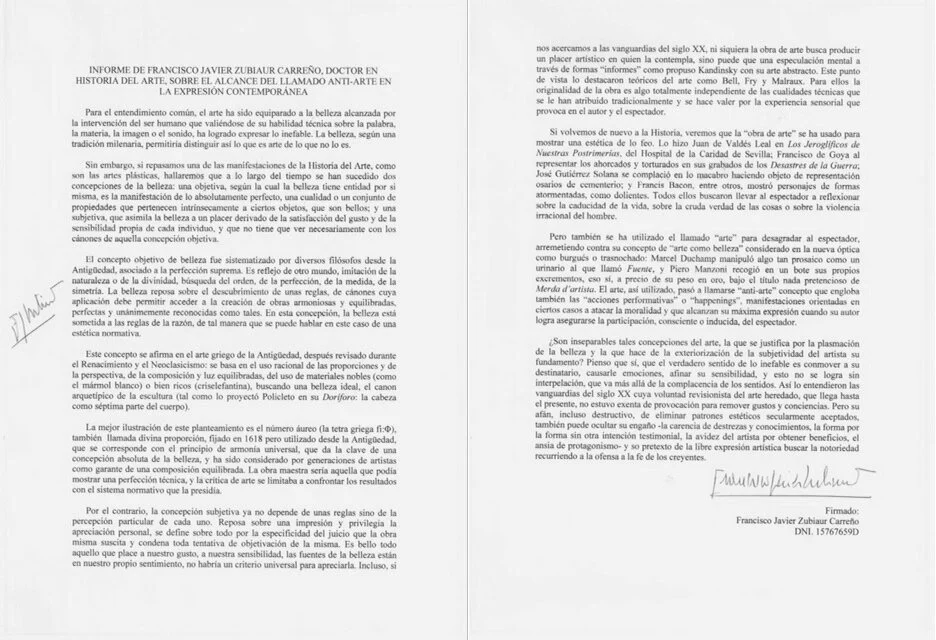 Report written by Francisco Javier Zubiaur Carreño, Doctor in Art History and Professor at the Opus Dei University of Navarra, as evidence in the accusation of the Archdiocese of Pamplona and Tudela against the artist Abel Azcona, accused of blasphemy and acquitted by the Court of Justice of Pamplona.