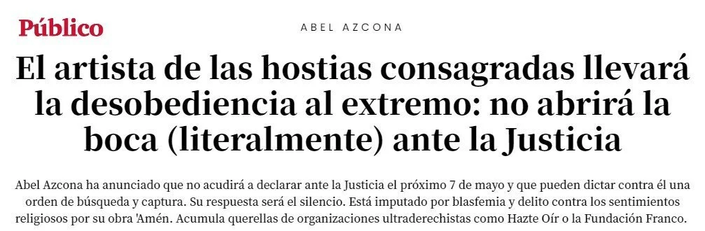 October 9, 2019. The Strasbourg Court admited the claim against artist Abel Azcona. The Spanish Association of Christian Lawyers denounced Spain for the work 'Amen' by artist Abel Azcona, that they consider "the greatest desecration in history."