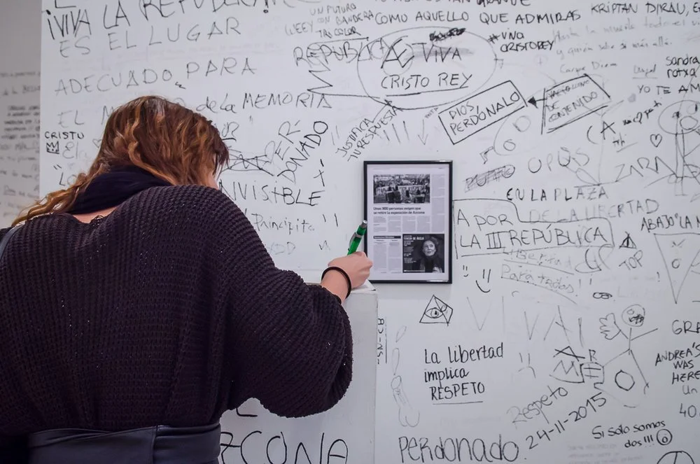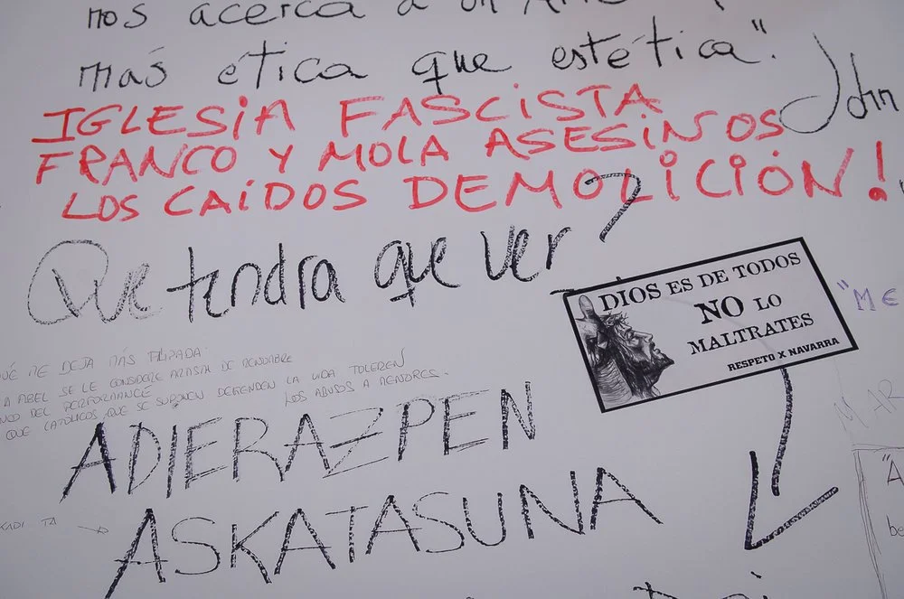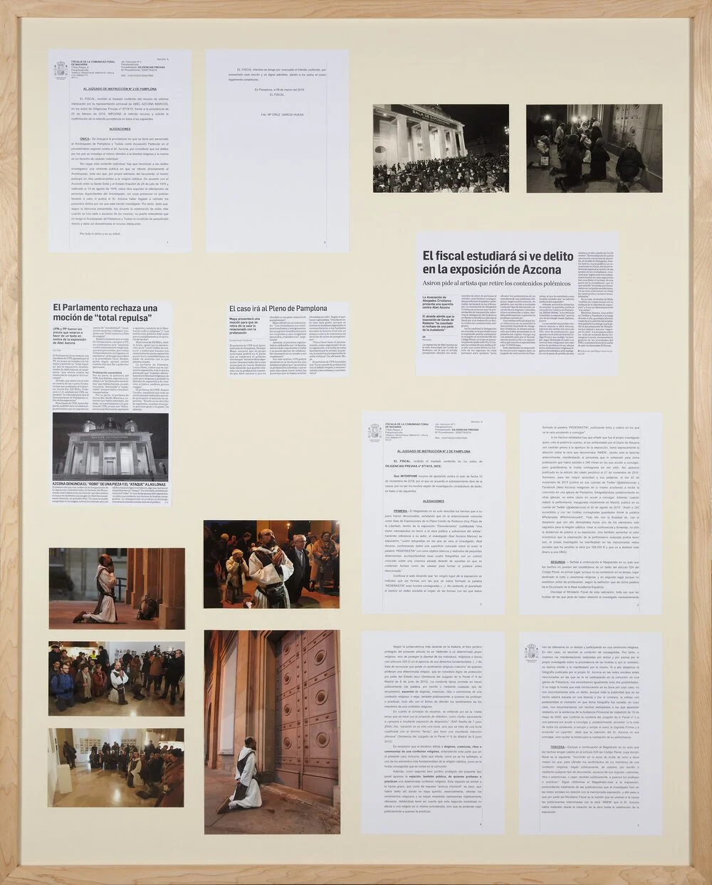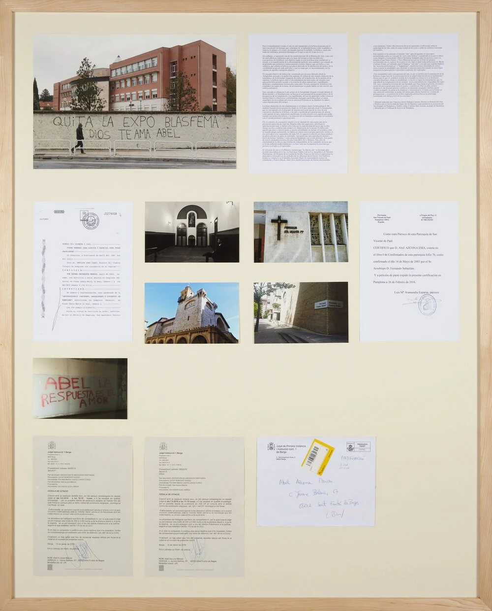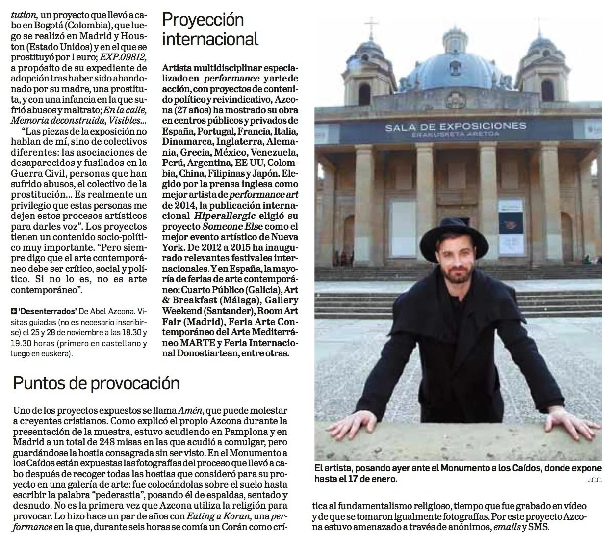 In November 2015, the work is curatorially included in the retrospective exhibition dedicated to Abel Azcona in his adoptive city of Pamplona. From November 2015 to January 2016, the Pamplona City Council organized an exhibition with more than two hundred works by Azcona created between 2005 and 2015. Despite having been exhibited in Madrid in an installation-based manner without controversy, the work transcended and gained great relevance by be exhibited in the exhibition dedicated to the artist inside the Monument to the Fallen in Pamplona.