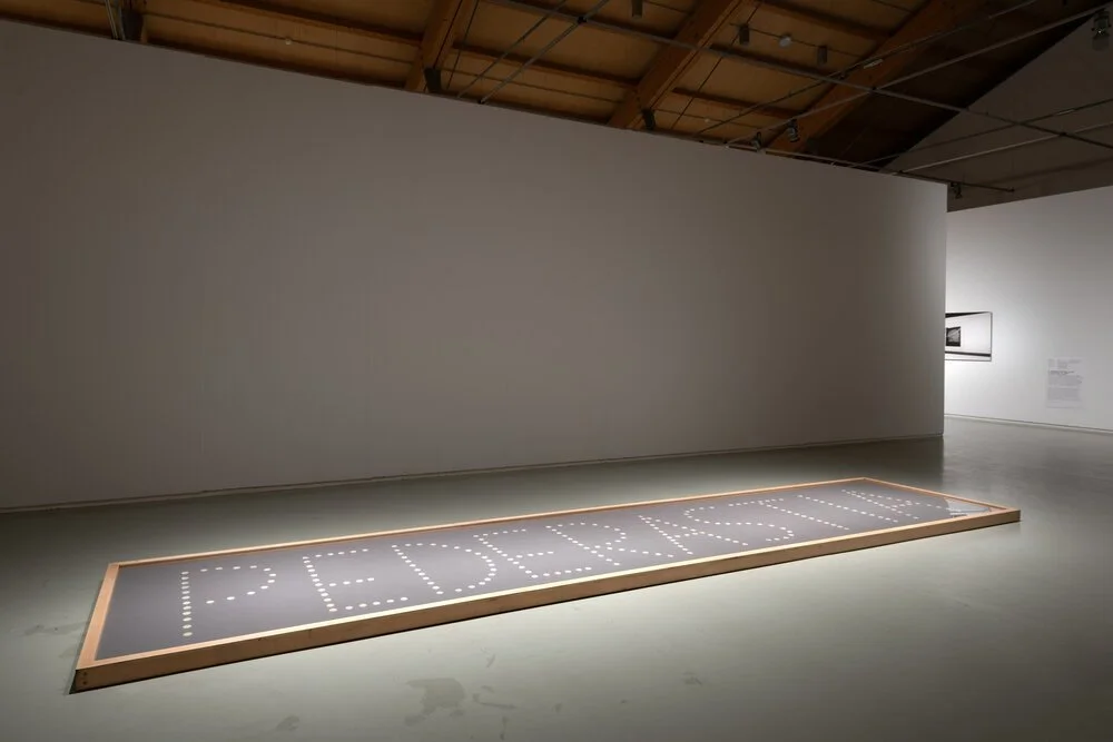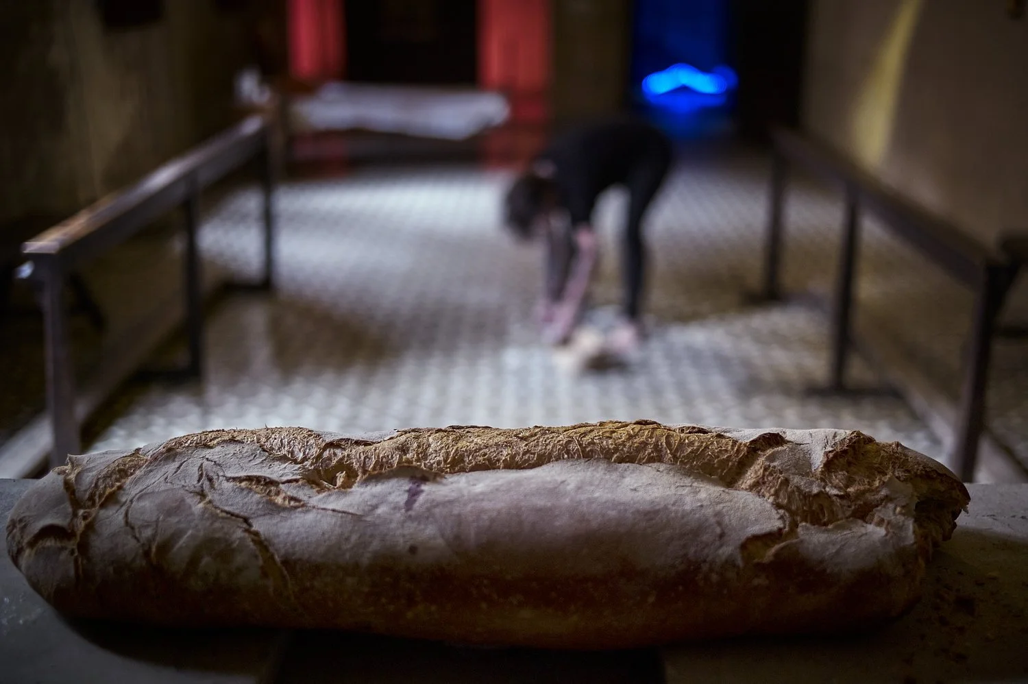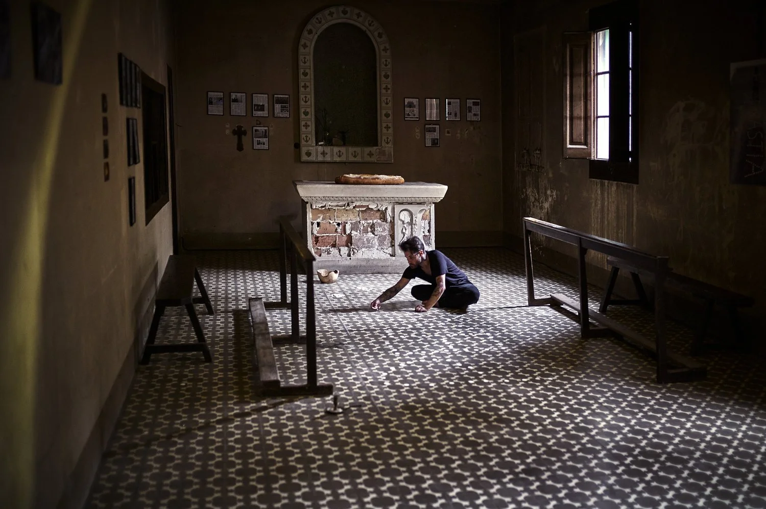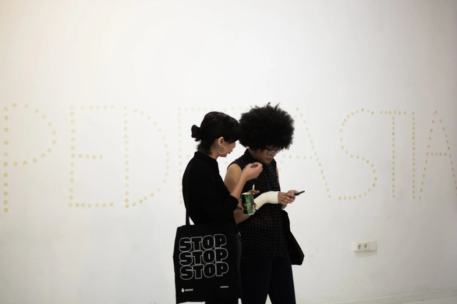 In the video and photographic images, Azcona can be seen, for two hours, fully dressed in black, writing the word “pedophilia” (“pederastia” in spanish) with 242 wafers. Some of the wafers collected during the first action were not used, when Azcona decided, during the process and formation of the word, to use only 242 of them, a figure that refers to the exact number of complainants and survivors who were part of the work “The Shadow ”by Azcona, where dozens of survivors of child abuse narrated and made their story visible.