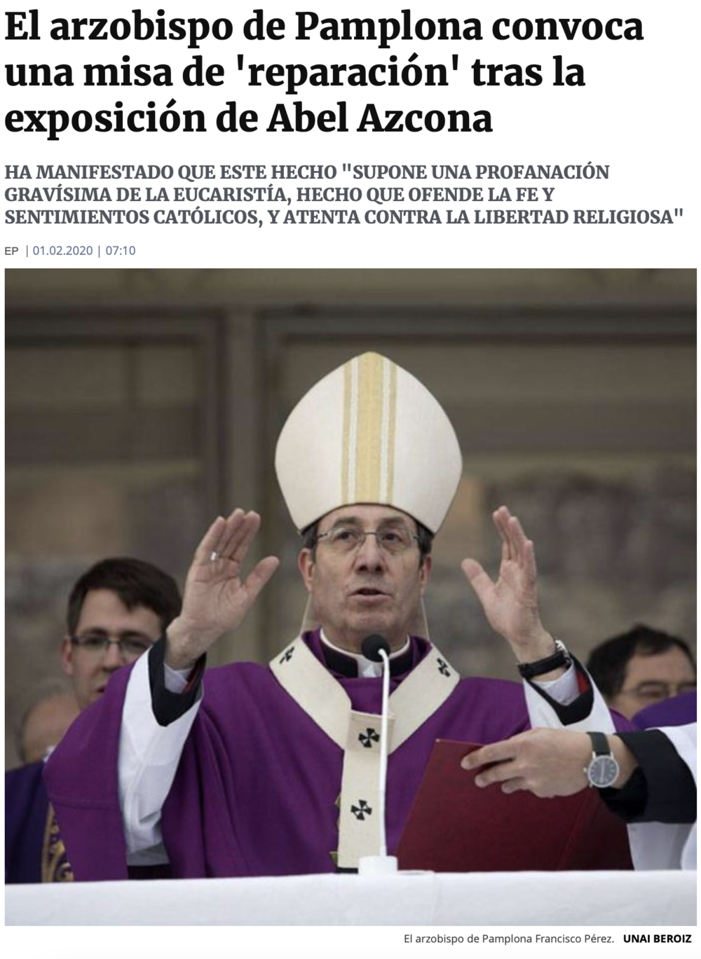 As Archbishop of the episcopal headquarters of Pamplona, as successor of the Apostles in this Diocese, gathering the sentiment of the Christian people not only from here but from all over the world, I am obliged to say that true freedom of expression does not include a supposed right to offense or contempt for the most sacred. Culture is beauty and harmony. It is a heritage of faith and life that our land in Navarra has enjoyed for centuries. The Eucharist is the sacramental sign of the highest beauty that exists in all of human history.