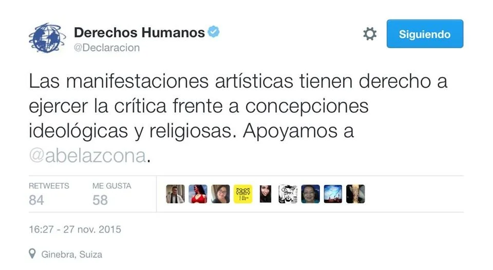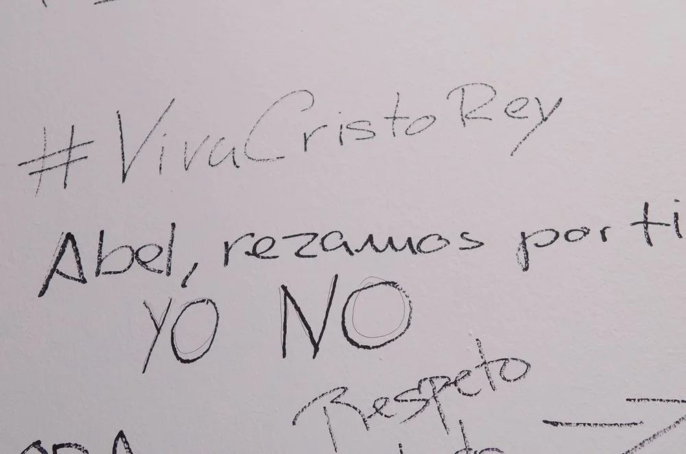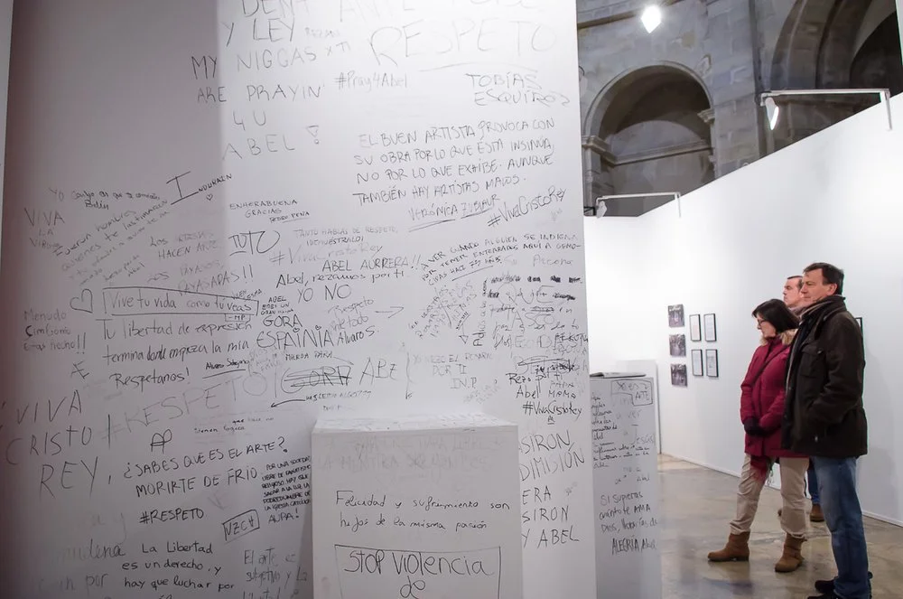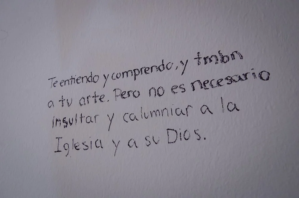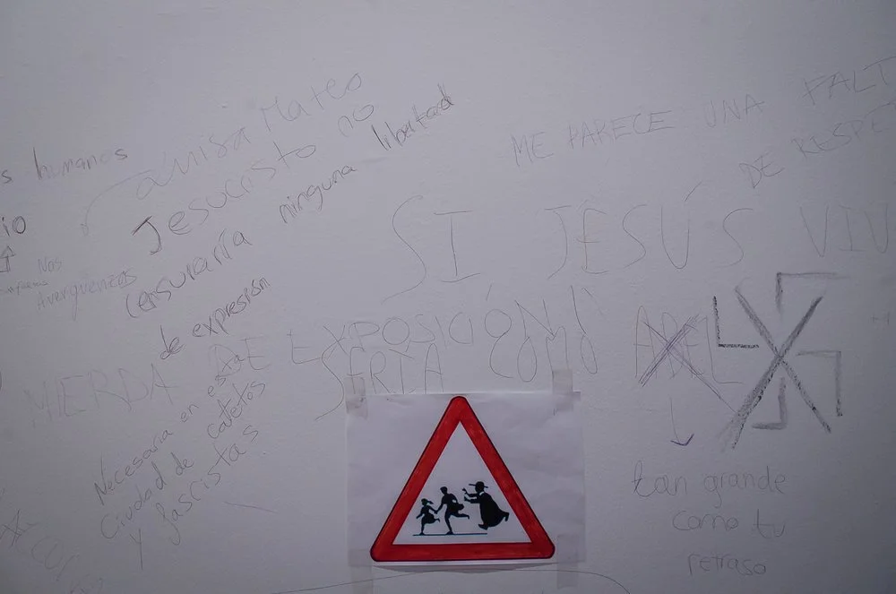 November 25, 2015. The exhibition reopened with hundreds of people at the entrance praying rosaries through a loudspeaker and dozens of them entered the interior of the exhibition hall and occupied the space on their knees shouting "Viva Cristo Rey". Since then, every opening day they occuped the room on their knees in the exhibition hall and in front of the work, praying the rosary or with ultra-catholic proclamations.