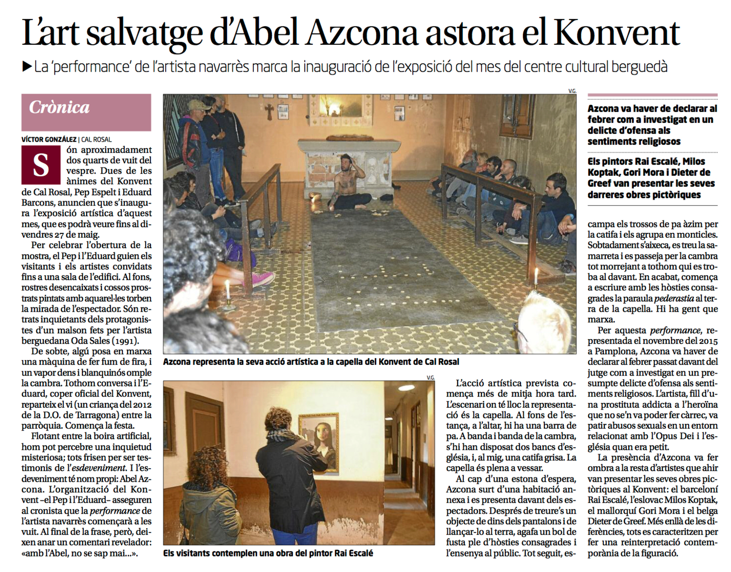 September 2015. Azcona inaugurated a series of performances and installations in an art gallery in the center of Madrid for two days, including the organic installation made up of the wafers collected during the intimate process that same summer. The installation was well received and got good reviews and no controversy.
