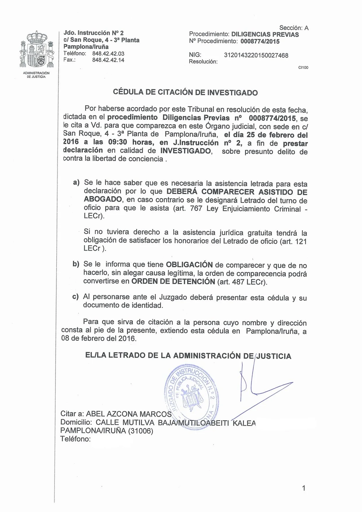 La denuncia fue interpuesta en el Juzgado de Guardia de Pamplona el 23 de Noviembre de 2017. Tres días después de la inauguración de la exposición retrospectiva dedicada al artista en Pamplona. PDF de la denuncia completa.