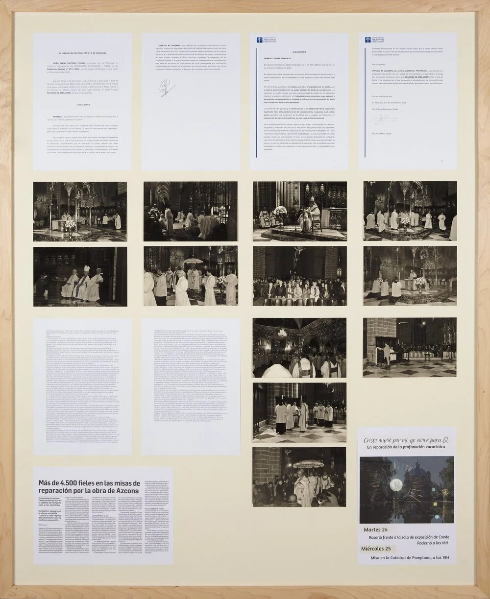 November 2015. The work “Buried” (“Enterrados”) by Azcona was chosen as the main piece in the exhibition “Unearthed (“Desenterrados”): A retrospective vision on the artist's political and subversive work.” The term “Des-” (“Un-”) was included in the title due to the concept of waste from other performances. Among the forty-two selected works, four photographs and a recipient with the wafers of the work "Amen or the Pederasty" were installed.