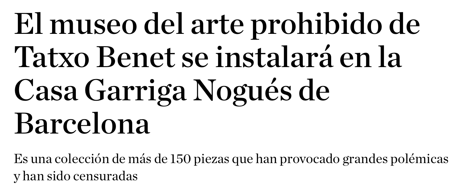 November 2018. The work's three parts - installation, photographic and documentary - were once again unified to be sold in its entirety to Tatxo Benet's Censored Art Collection together with censored and persecuted historical works by Ai Weiwei, Francisco De Goya, Santiago Sierra , Robert Mapplethorpe or Andres Serrano. The organic installation measures 7.50m x 1.20 m and the six documentary frames 1.50m x 1.00m.