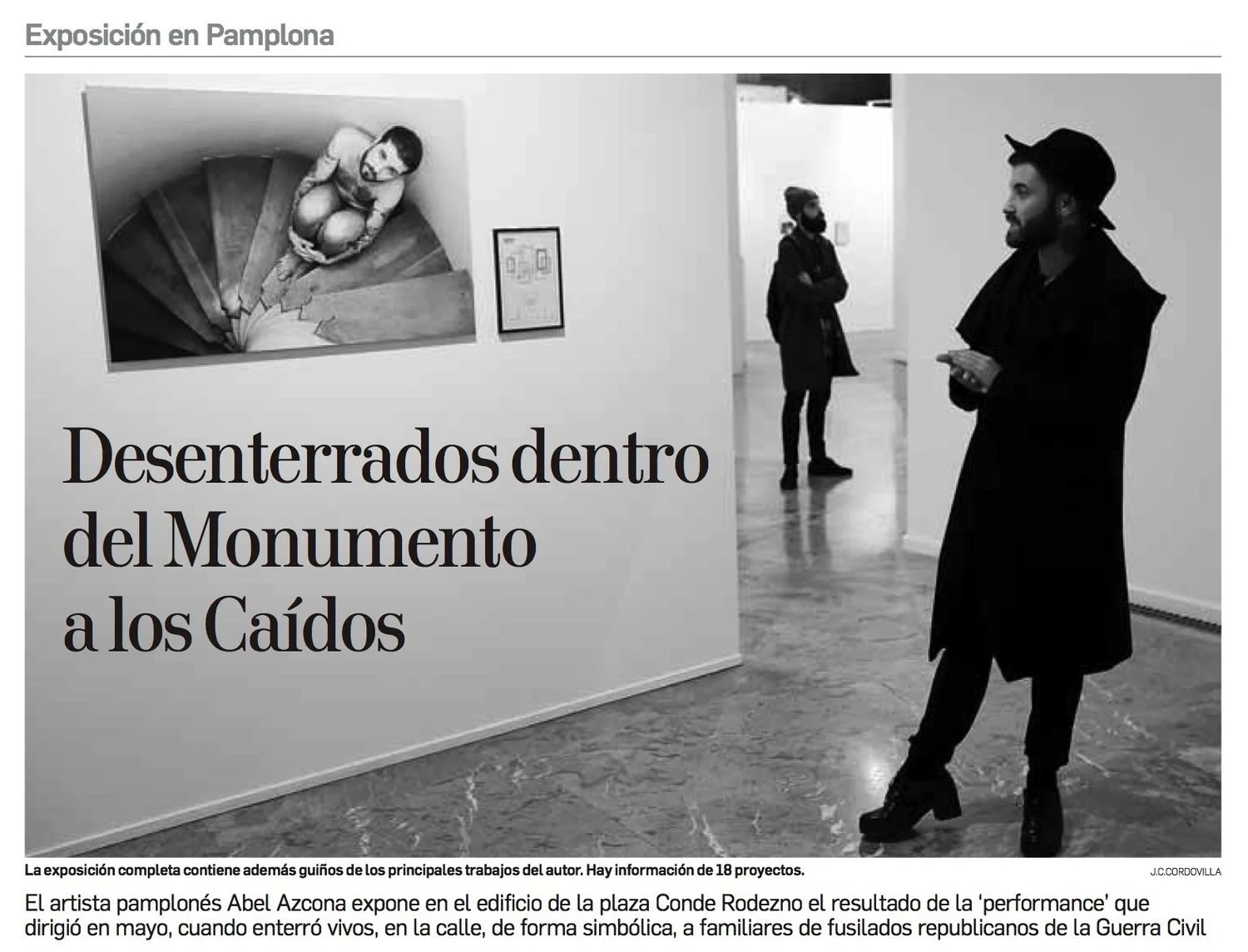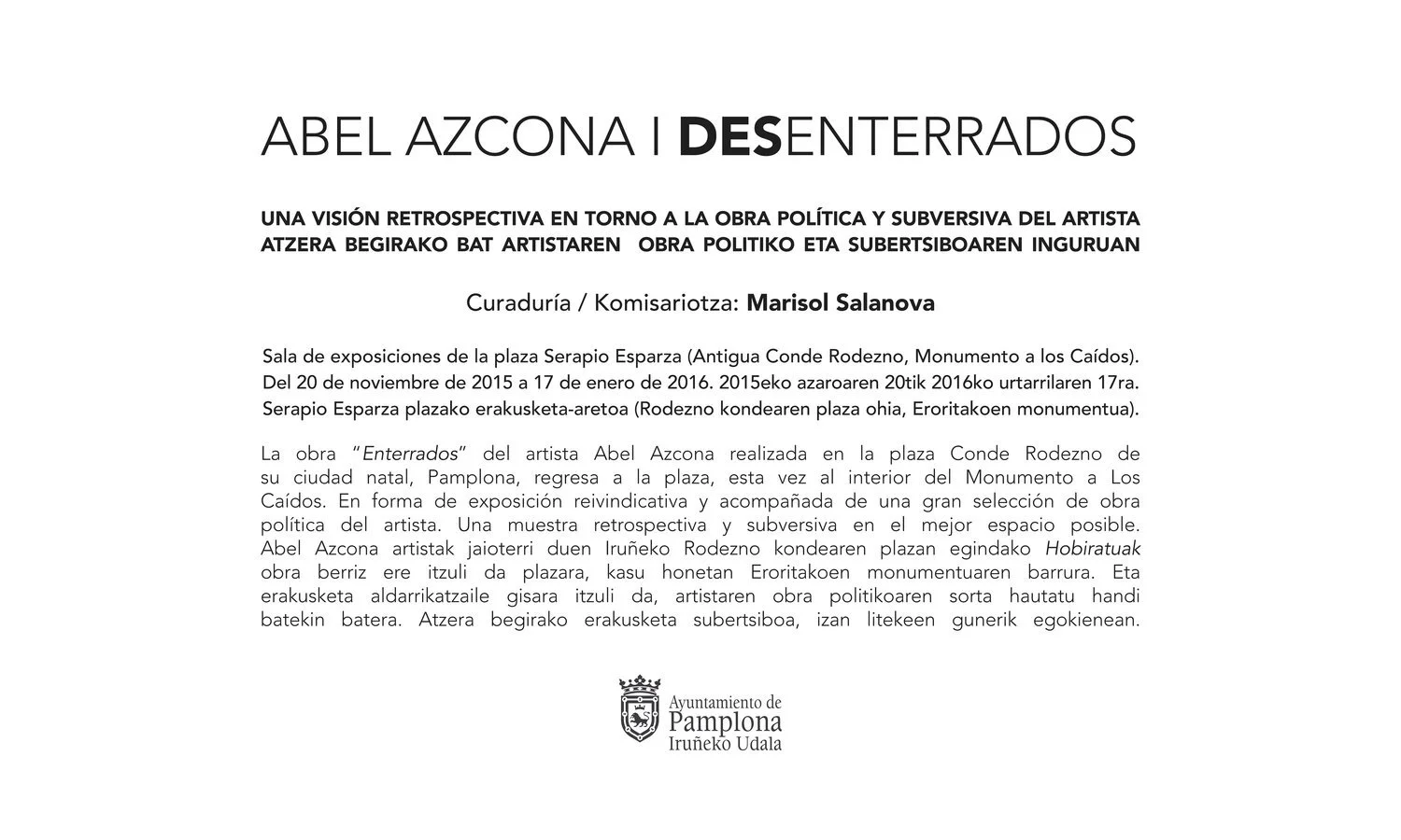 Octubre de 2015. El Ayuntamiento de Pamplona invita a Azcona a exponer e un edificio público, y entre la institución, el propio Azcona y curaduría seleccionan el Monumento a los Caídos situado en la Plaza de la Libertad de Pamplona como edificio expositivo.