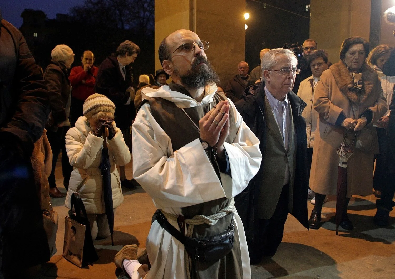 Cientos de personas rezando el Rosario en la puerta de la exposición. Fotografía © Sesma / Buxens.