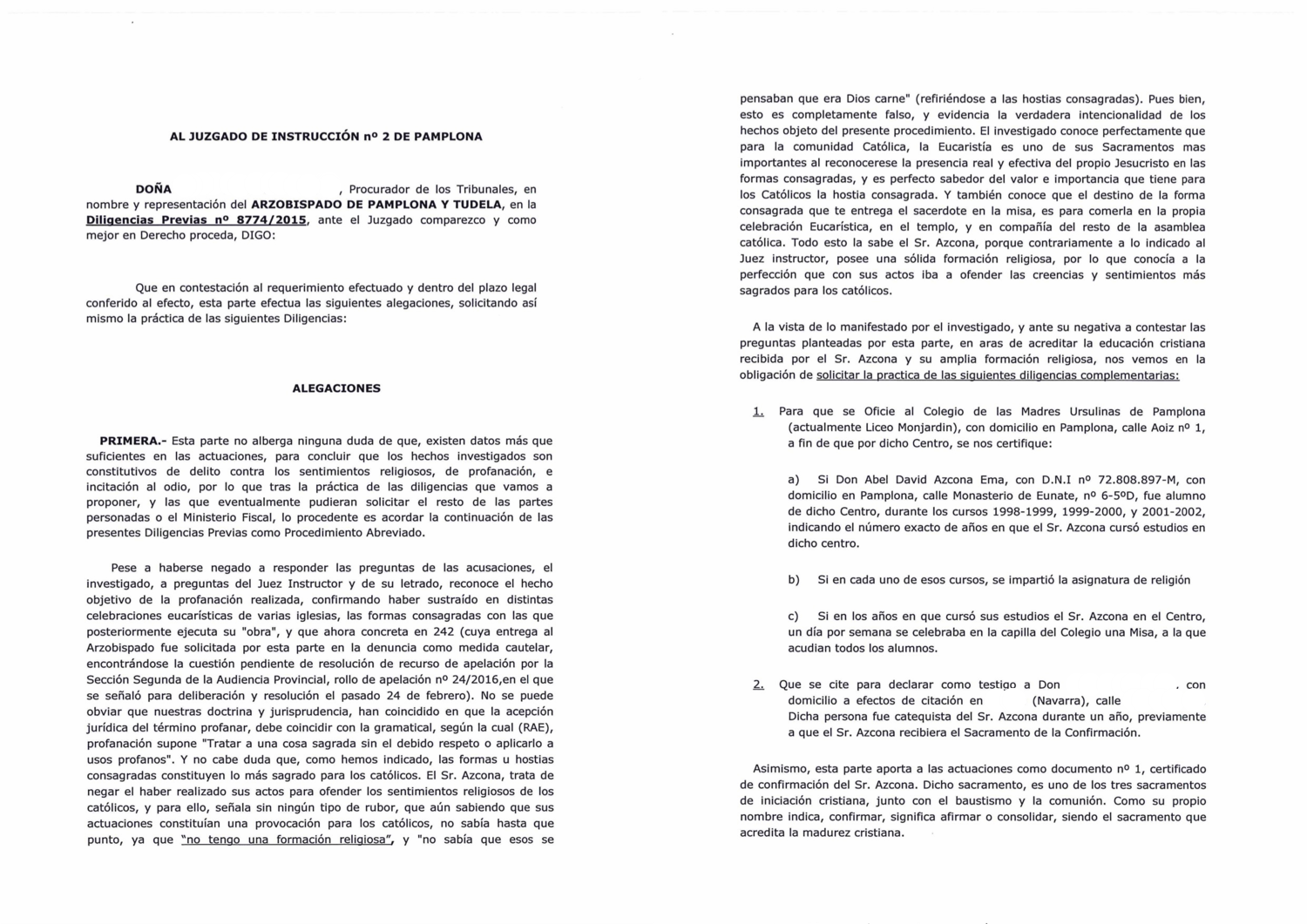 Nuevas alegaciones del 29 de Febrero de 2017 del Arzobispado de Pamplona y Tudela posteriores a la comparecencia del artista Abel Azcona en el Palacio de Justicia. PDF completo.