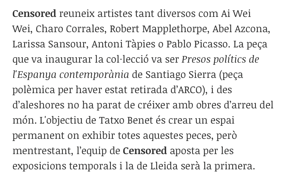 26 de septiembre de 2020. La obra es inaugurada de forma completa en el Centro de Arte Contemporáneo La Panera de Lleida junto a otras obras históricas censuradas como Piss Christ de Andrés Serrano, X Portfolio de Robert Mapplethorpe, varias piezas de Ai Weiwei y La civilización occidental y cristiana de Leo Ferrari, todas ellas parte de la Colección de Arte Contemporáneo Censored de Tatxo Benet.