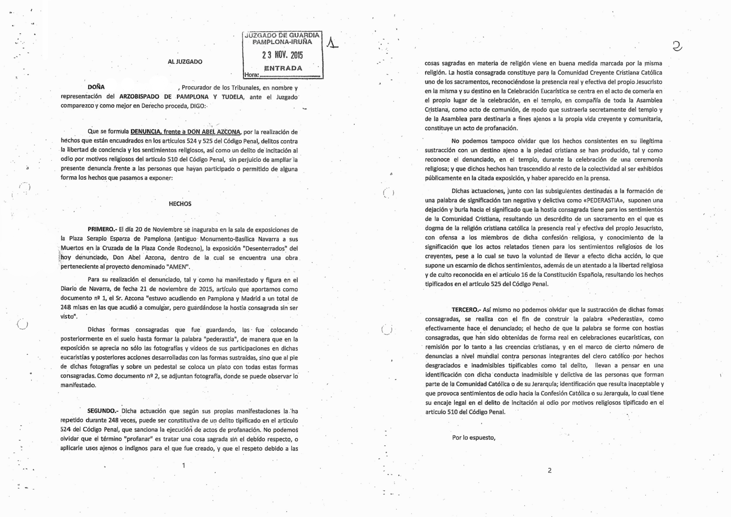 Primeras hojas de la denuncia del Arzobispado de Pamplona y Tudela contra el artista Abel Azcona. Denuncia presentada por el Arzobispado de Pamplona y Tudela, en representación De la Iglesia Navarra, en representación De la Iglesia Católica, ambas instituciones firmantes de la denuncia contra el artista Abel Azcona.
