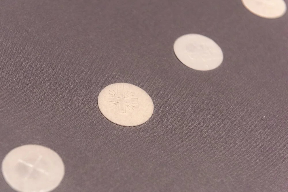 Mayo, junio, julio y agosto de 2015. Azcona asiste a más doscientas iglesias y parroquias madrileñas y navarras y recopila más de doscientas cincuenta obleas durante el sacramento de la eucaristía.