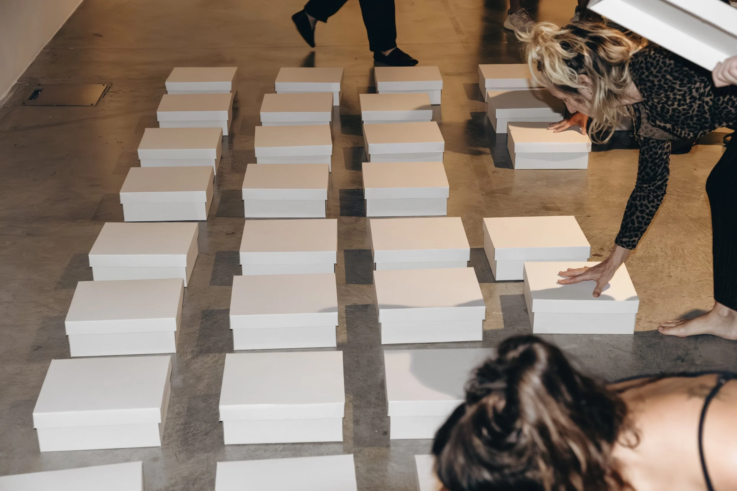 Tenth brief action – Fifty Empty Boxes. At the end of 2025, Azcona will present an exhibition with twelve large-scale works in collaboration with fifty mothers and fifty children separated at birth in different maternity wards in Madrid, such as Clínica San Ramón or the Montesa Maternity, where Azcona himself was born. Today begins one of those works in an action of construction and denunciation, moving from the individual to the collective, culminating in an installation.