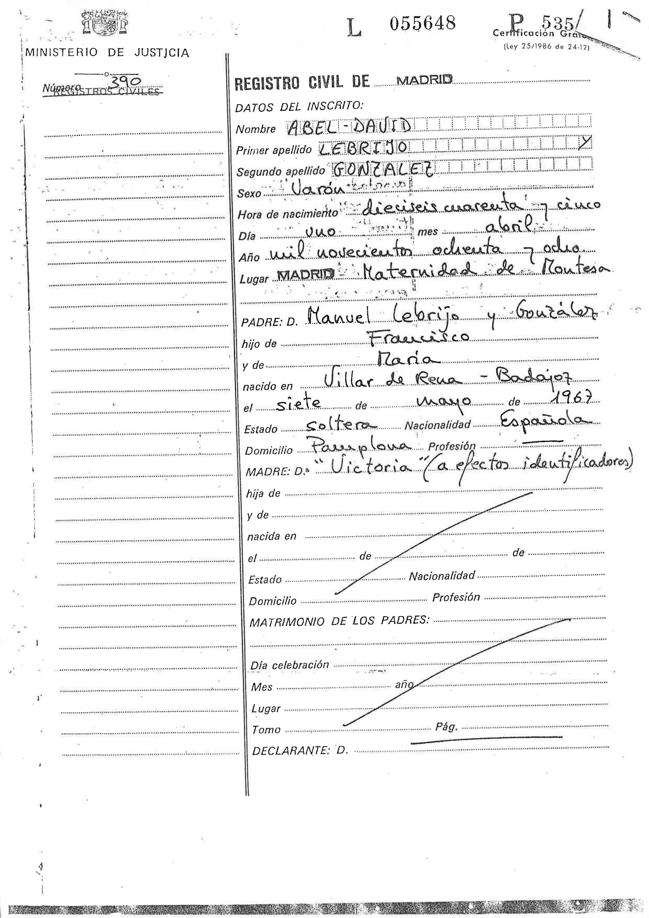 Poco después llegamos a Badajoz. Aparcamos muy cerca del lugar que lo vio nacer. Nos sentamos en una piedra y sacamos la carpeta para poder ver juntos todos los papeles. Aquel lugar no se me olvidará. Daba la sensación de no estar en ninguna parte. Le temblaba la mano izquierda cuando abrió la carpeta y leyó el expediente 09872. Durante un tiempo solo fui aquel número. En la parte baja de la página podía leerse el nombre Abel David Lebrijo. «Mis apellidos», añadió.