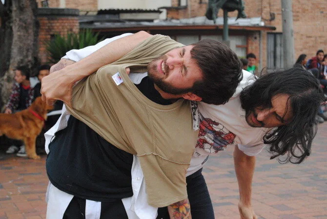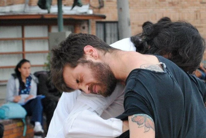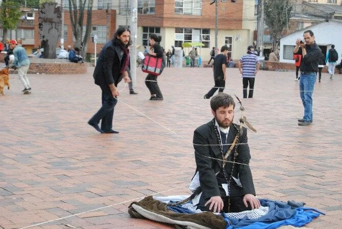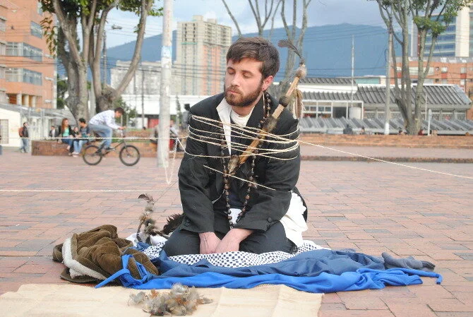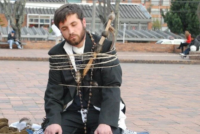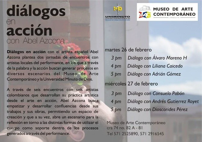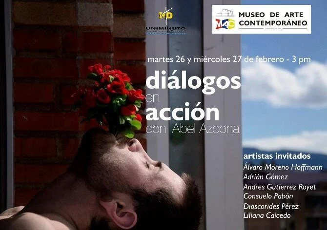 At the Museum of Contemporary Art in Bogotá, Azcona invited different Colombian artists and theorists in order to create a series of dialogues through the body and the word. In these dialogues, the invited artists and theorists designed and developed a series of body actions and conversations. In each of the encounters we could see how each Colombian artist embodied and dialogued with Azcona in pieces with diverse themes about identity, colonialism or spirituality. The invited artists in Colombia were: Adrián Gómez, Andrés Gutiérrez Royet, Dioscórides Pérez and Liliana Caicedo. The theorists were: Álvaro Moreno Hoffmann and Consuelo Pabón. The rooms, the entrance and the main square of the Museum of Contemporary Art of Bogotá were the protagonists of these dialogues of body and words, where identity, political and conceptual art were theorized.