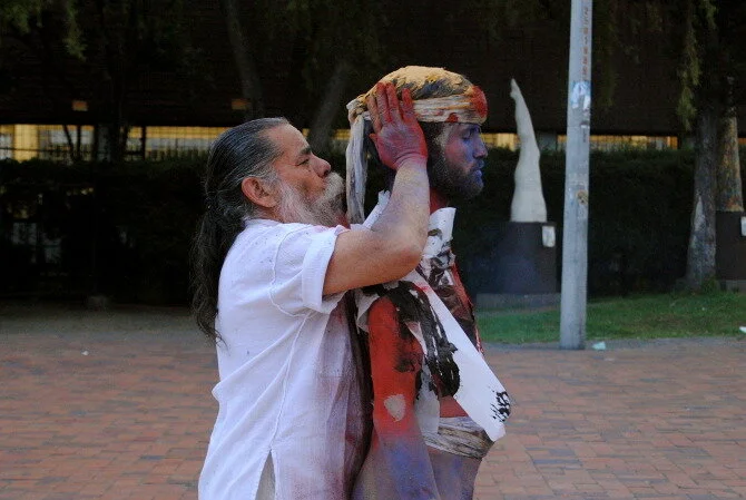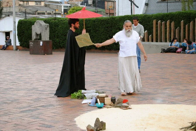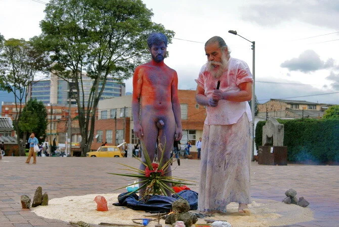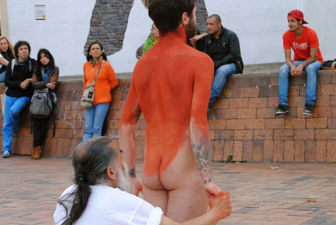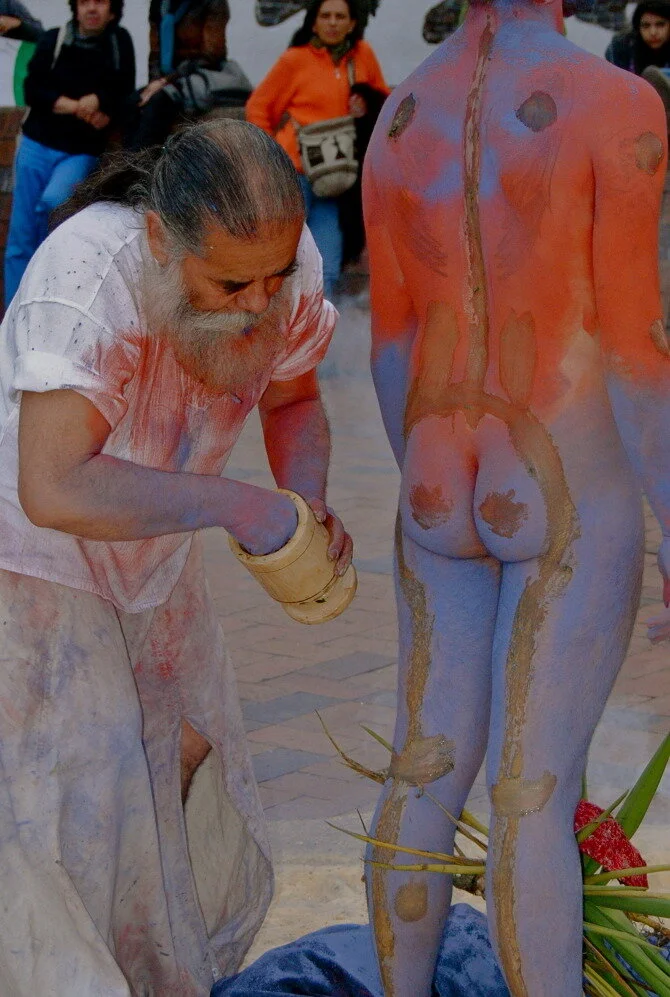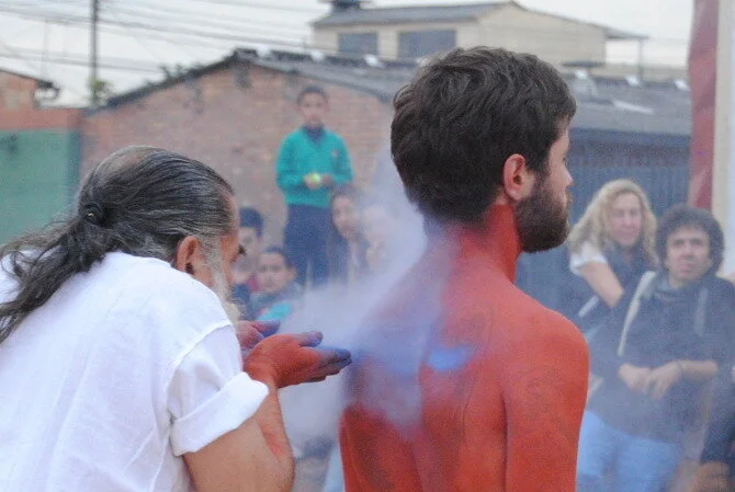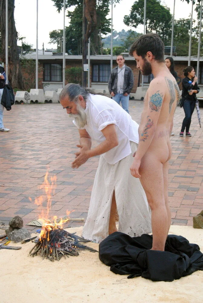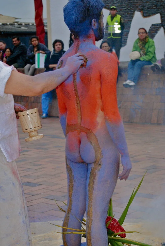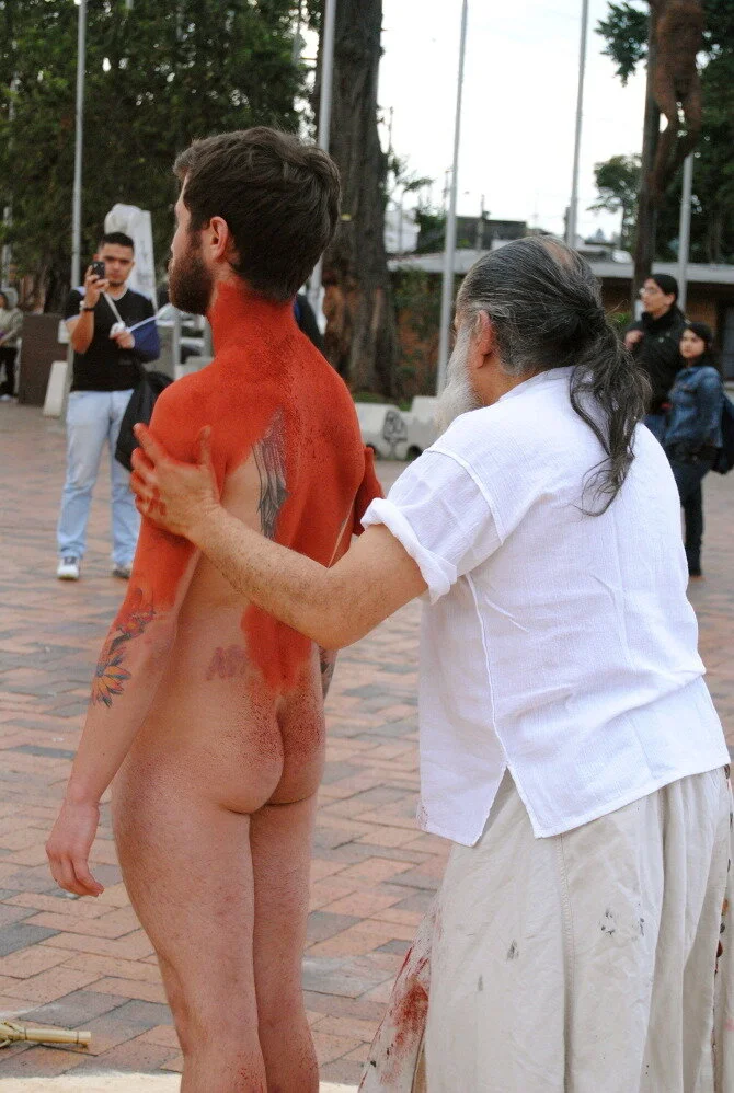 The closing of the process of body and word dialogue, that lasted several days, at the Museum of Contemporary Art in Bogotá, was with the artist and professor at the National University of Colombia, Dioscórides Pérez. The fourth dialogue that Azcona had with Pérez, having been locked up in previous processes for days with the artist in the Santa Fé Gallery, or having inhabited the rivers and fields of Anolaima with different bodily processes. In this process, by way of closing, Pérez performed a cleansing and healing ritual on Azcona, nothing spiritual and far from Pérez's ideas, in the center of the Museum Square. In the action, Dioscórides closed moments with Abel opened in previous actions and walks in the Monserraten mountain range, with a ritual marked by the smell, the earth and the color, common resources in his creations.