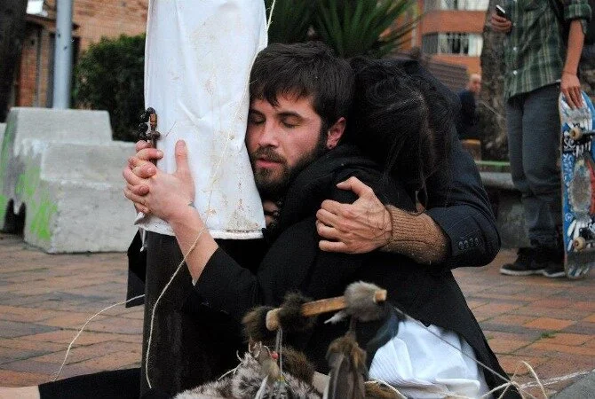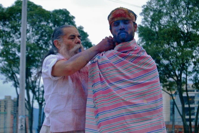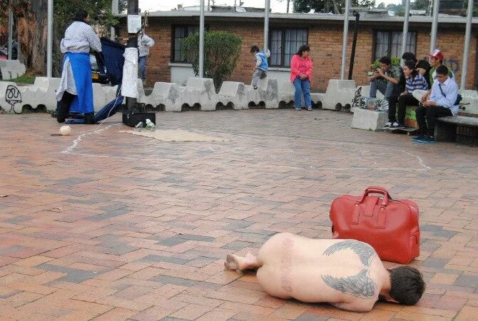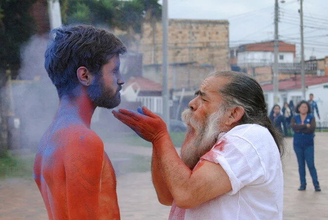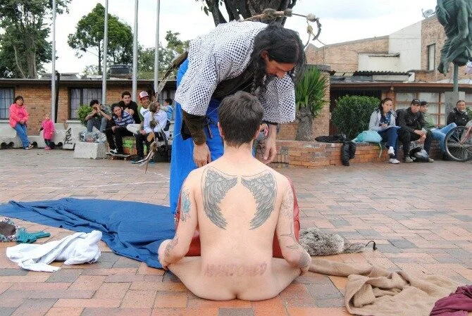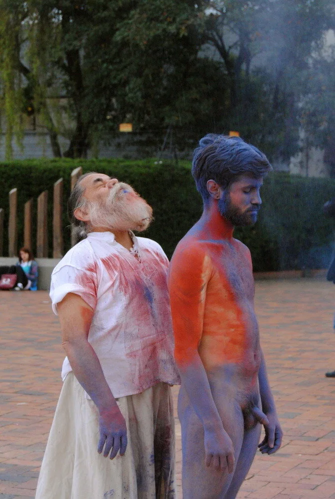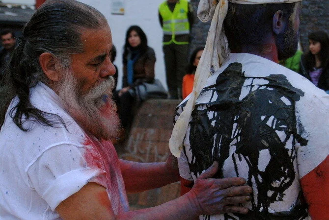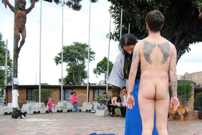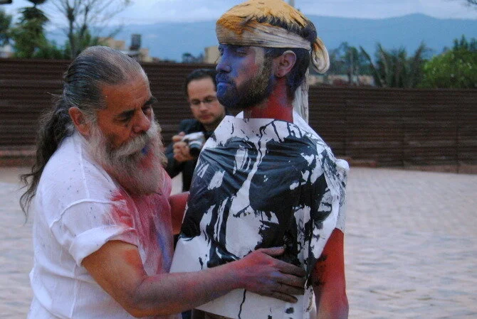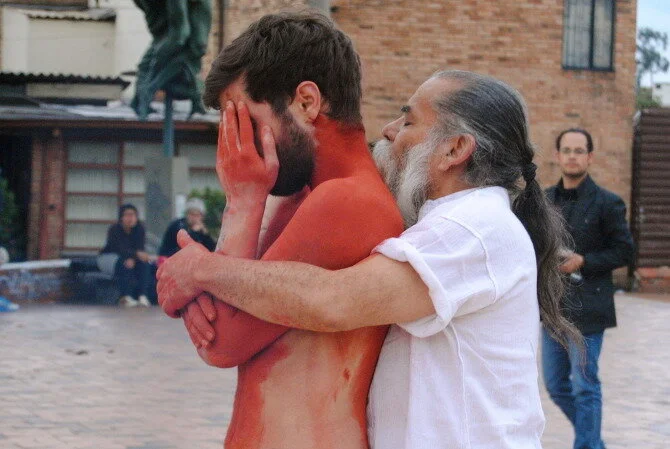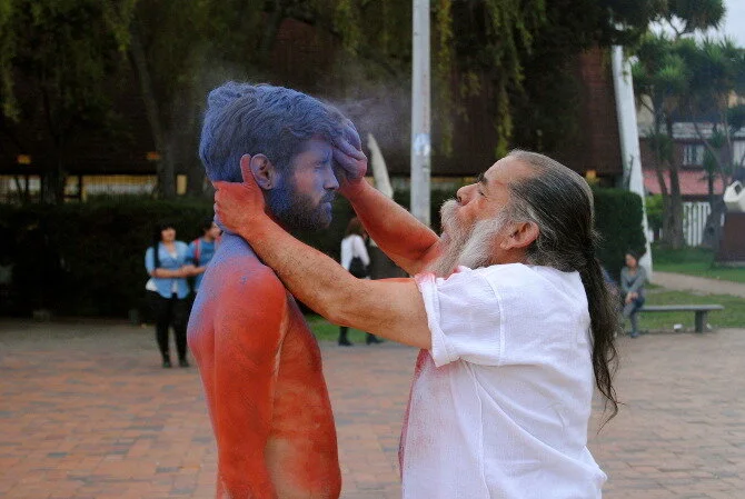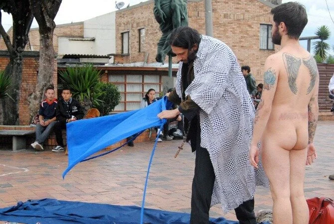 The closing of the process of body and word dialogue, that lasted several days, at the Museum of Contemporary Art in Bogotá, was with the artist and professor at the National University of Colombia, Dioscórides Pérez. The fourth dialogue that Azcona had with Pérez, having been locked up in previous processes for days with the artist in the Santa Fé Gallery, or having inhabited the rivers and fields of Anolaima with different bodily processes. In this process, by way of closing, Pérez performed a cleansing and healing ritual on Azcona, nothing spiritual and far from Pérez's ideas, in the center of the Museum Square. In the action, Dioscórides closed moments with Abel opened in previous actions and walks in the Monserraten mountain range, with a ritual marked by the smell, the earth and the color, common resources in his creations.