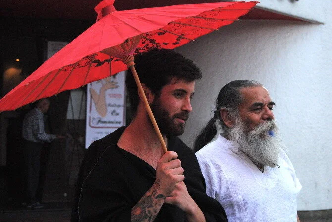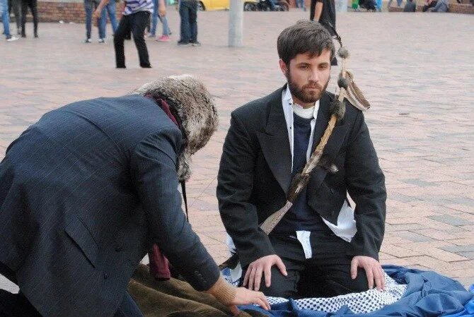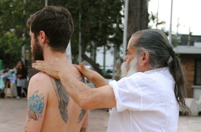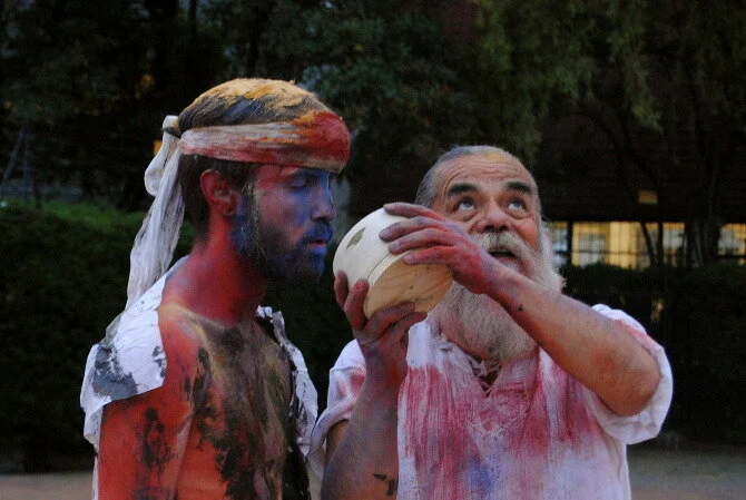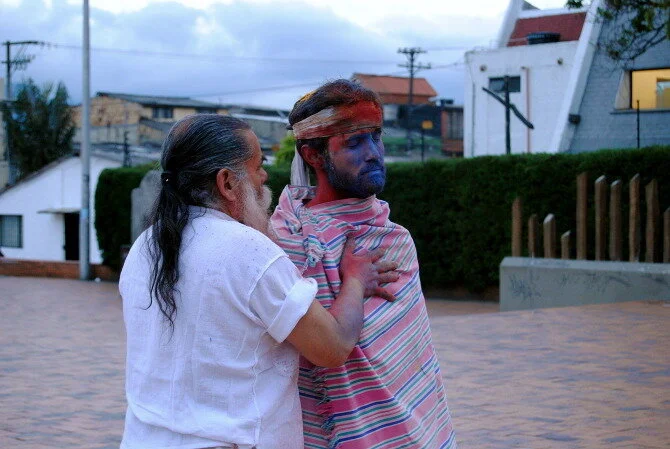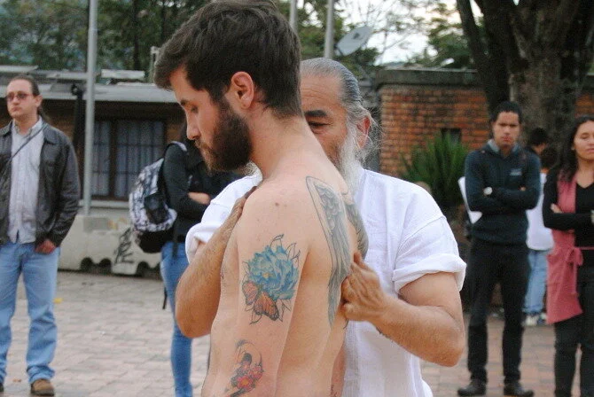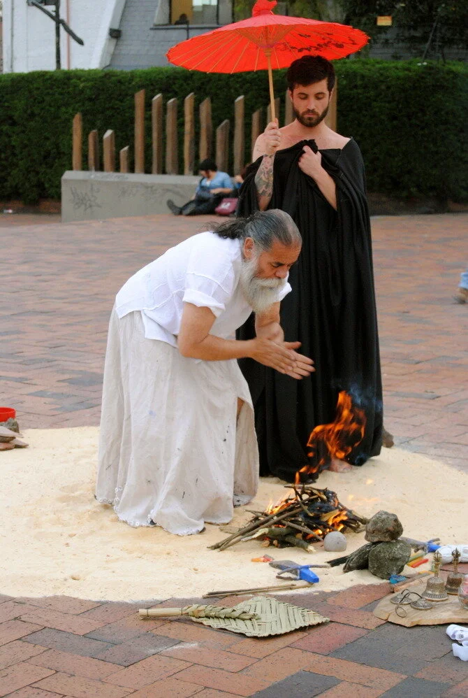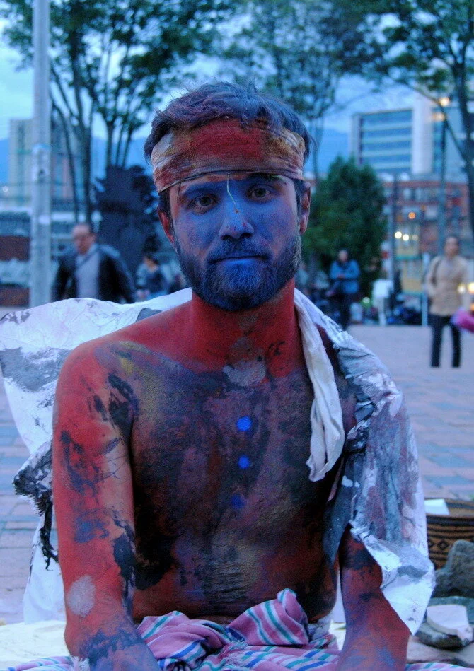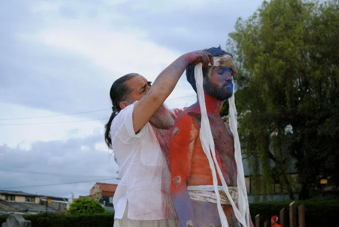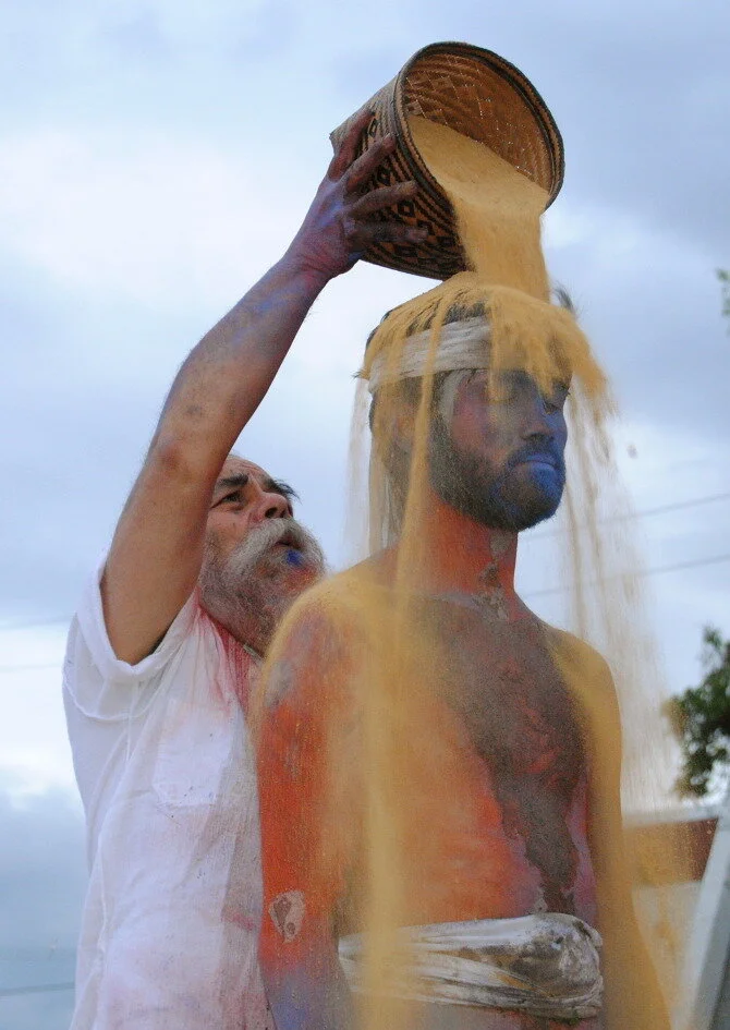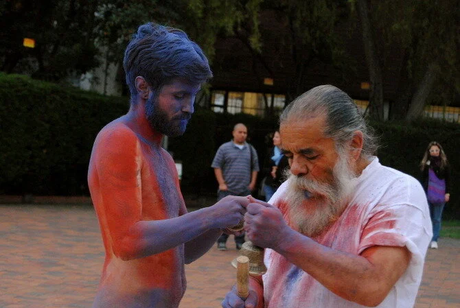 The closing of the process of body and word dialogue, that lasted several days, at the Museum of Contemporary Art in Bogotá, was with the artist and professor at the National University of Colombia, Dioscórides Pérez. The fourth dialogue that Azcona had with Pérez, having been locked up in previous processes for days with the artist in the Santa Fé Gallery, or having inhabited the rivers and fields of Anolaima with different bodily processes. In this process, by way of closing, Pérez performed a cleansing and healing ritual on Azcona, nothing spiritual and far from Pérez's ideas, in the center of the Museum Square. In the action, Dioscórides closed moments with Abel opened in previous actions and walks in the Monserraten mountain range, with a ritual marked by the smell, the earth and the color, common resources in his creations.