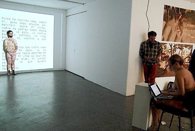 En torno a la identidad y a la memoria, en una exploración continua de los recuerdos marcados por el maltrato o el abuso fue el dialogo llevado a cabo por Liliana Caicedo y Azcona. Ambos cuerpos desnudos emplearon la palabra escribiendo en vivo sus duras experiencias sobre el otro creador, por lo que el visitante podía leer y sentir cada una de estas vivencias en los cuerpos heridos del otro. Una experiencia de catarsis marcada por procesos de supervivencia extrema.