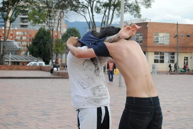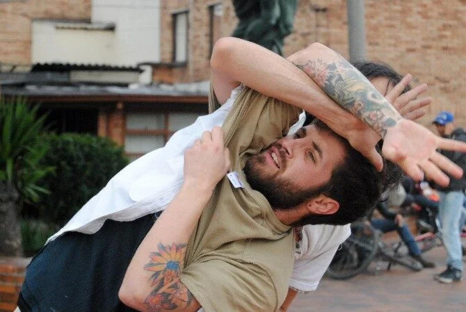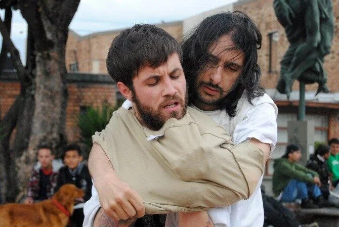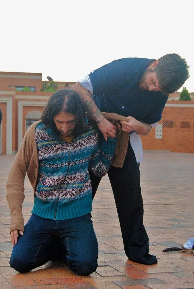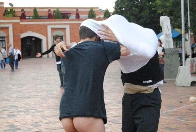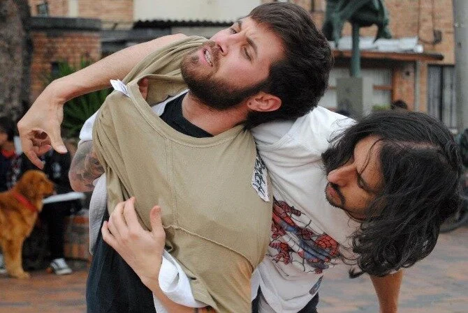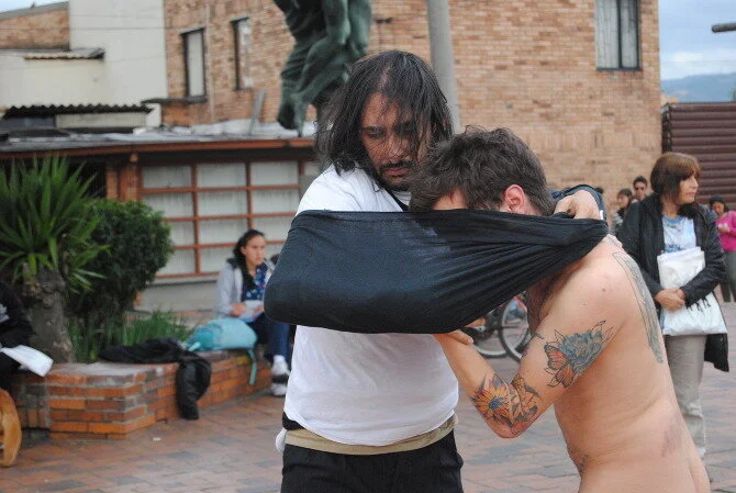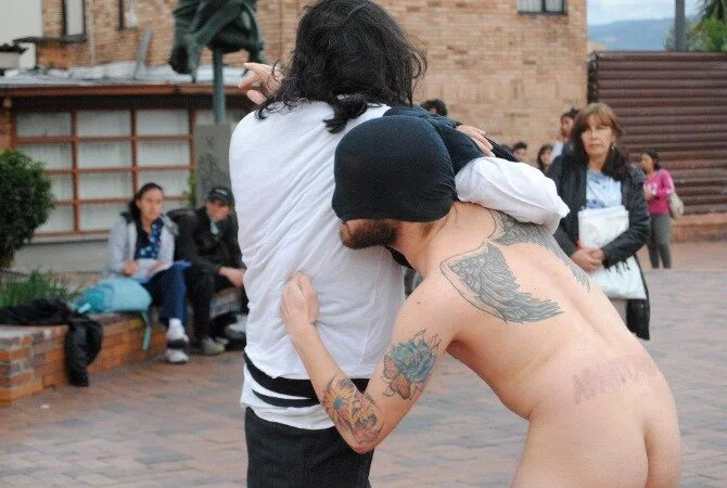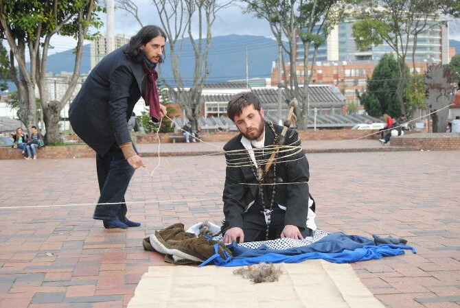 The dialogue in action between the artists Adrián Gómez and Abel Azcona took place at the entrance and in the square of the Museum of Contemporary Art of Bogotá. Both artists had previously collaborated in an exhibition at the Santa Fé gallery, so Gómez knew of Azcona's interests in deconstructing the generalized idea of colonialism, and Azcona knew of Gómez's interests to explore around the heredity, memory and memories through clothing and installations with garments and souvenirs. Thus, in an ephemeral and fluid way, a dialogue between the two developed at the feet of the Christ that crowns the square in front of the Museum. A powerful visual image crossed between a naked Azcona and an overdressed Gómez in bodily processes of intense physicality in which both inherited and transmitted the mutual load and memory.