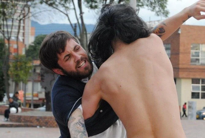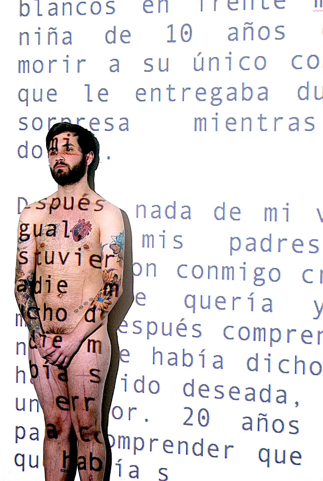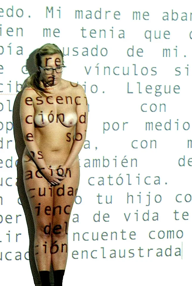About identity and memory, in a continuous exploration of memories marked by mistreatment or abuse was the dialogue carried out by Liliana Caicedo and Azcona. Both naked bodies used word to write their harsh life experiences on the other creator, so that the visitor could read and feel each of these experiences in the wounded bodies of the other. An experience of catharsis marked by processes of extreme survival.