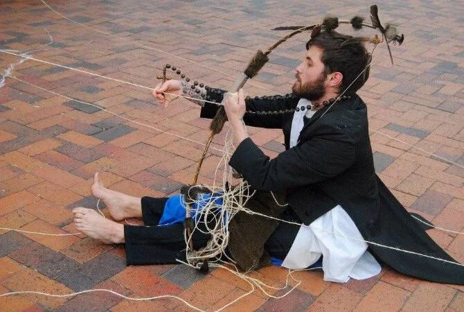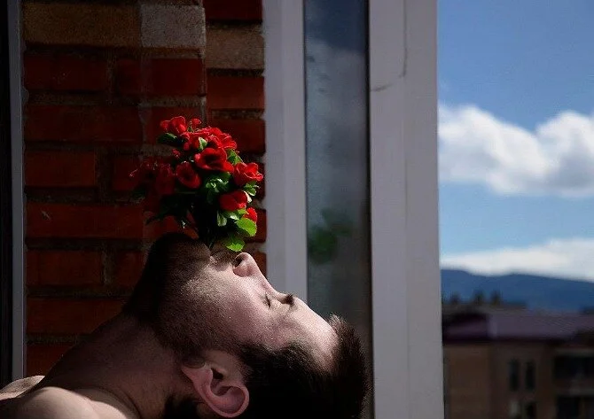 Abel Azcona photographed in the context of the International Performance Biennial of Pamplona in the Huarte Contemporary Art Centre. / Abel Azcona fotografiado en el marco de la Bienal Internacional de Performance de Pamplona en el Centro de Arte Contemporáneo de Huarte.
