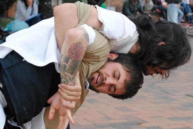 Uno de los diálogos mas límites fue llevado a cabo por el artista Andrés Gutiérrez Royet y Azcona en la planta baja del Museo de Arte Contemporáneo de Bogotá. En este, de dos horas de duración, ambos artistas cosen y fusionan sus cuerpos mediante hilo y cuerdas, por lo que cualquier movimiento hiere, profundiza y desgarra parte de su piel. Un diálogo en sangre y fluidos que instaló una herencia en el suelo del museo, marcado por la violencia y la herencia vivida y verbalizada mediante el cuerpo por ambos artistas.
