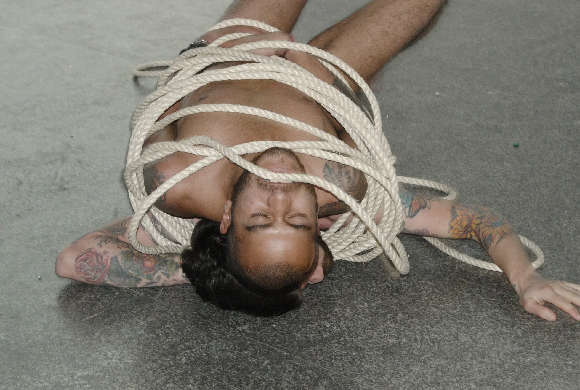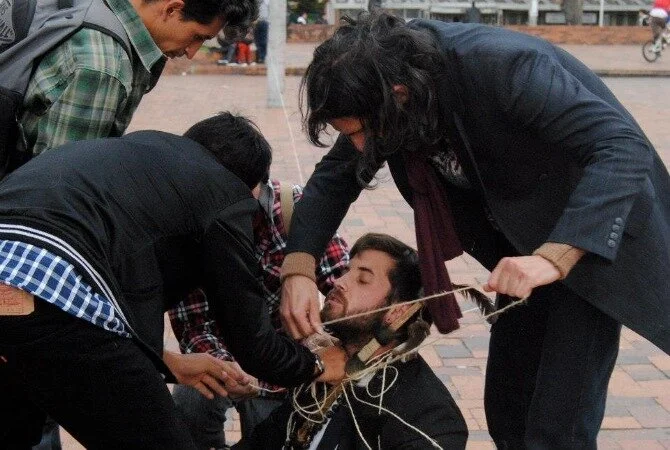 One of the most extreme dialogues was carried out by artist Andrés Gutiérrez Royet and Azcona on the ground floor of the Museum of Contemporary Art in Bogotá. In this action, which lasted two hours, both artists sewed and fused their bodies using thread and ropes, so that any movement hurted, deepeened and teared part of their skin. A dialogue in blood and fluids that installed an heritage on the museum floor, marked by violence and the inheritance lived and verbalized through the body by both artists.
