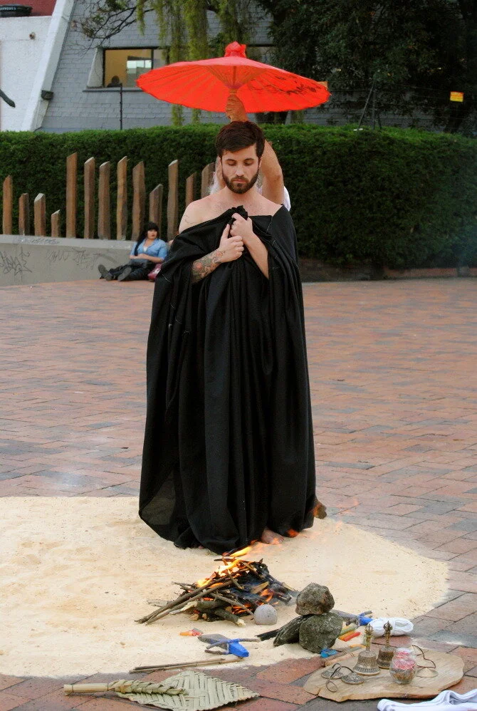 El diálogo en acción entre los artistas Adrián Gómez y Abel Azcona se desarrolló a la entrada y en la plaza del Museo de Arte Contemporáneo de Bogotá. Ambos artistas ya habían colaborado previamente, en una muestra expositiva en la galería de Santa Fé, por lo que Gómez conocía los intereses de Azcona en torno a deconstruir la idea generalizada de colonialismo, y Azcona conocía los intereses de Gómez por explorar en torno a la herencia, la memoria y los recuerdos a través de la vestimenta e instalaciones con prendas y recuerdos. Así, de forma efímera y fluida se desarrolló un dialogo entre ambos a los pies del Cristo que corona la plaza frente al Museo. Una potente imagen visual cruzada entre un Azcona desnudo y un Gómez sobrevestido en procesos corporales de intensa fisicalidad en los que ambos heredaban y transmitían la carga y memoria mutua.