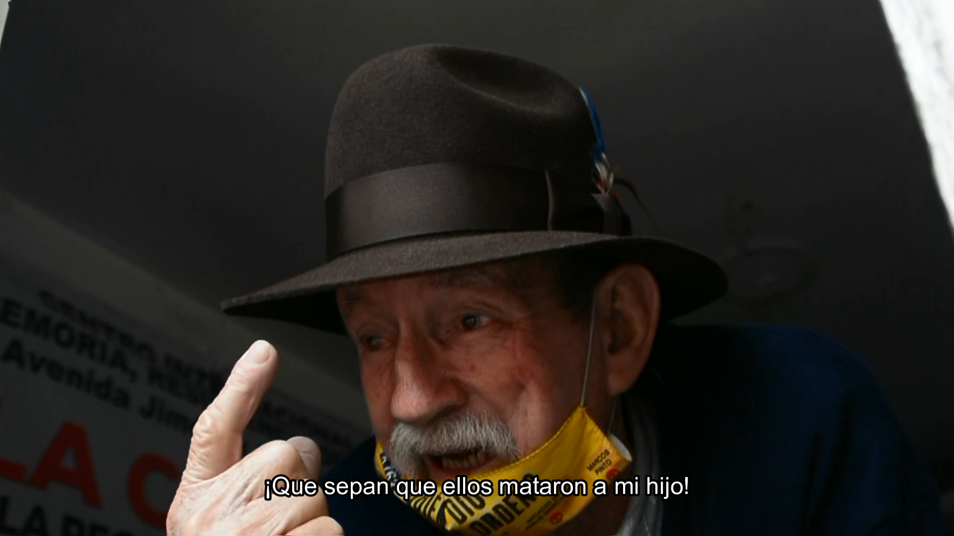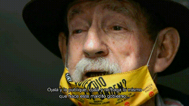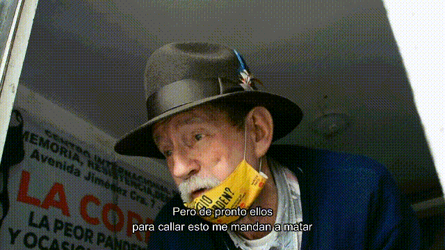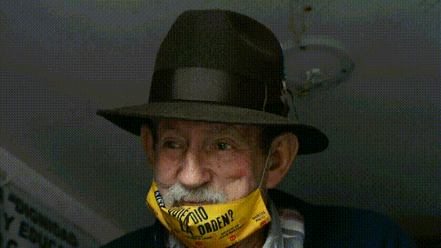 Sin importarle el covid-19, Don Raúl hablaba con el tapabocas abajo para que todos pudiesen escuchar lo que su debilitada voz por la edad estaba dispuesta a decir. En el tapabocas se lee “¿Quién dio la orden?” acompañado de los nombres de oficiales de alto mando de las fuerzas militares colombianas.