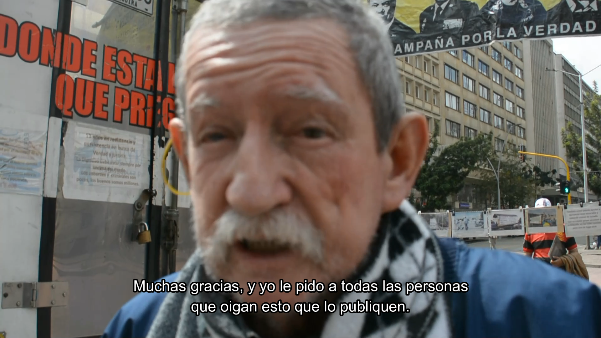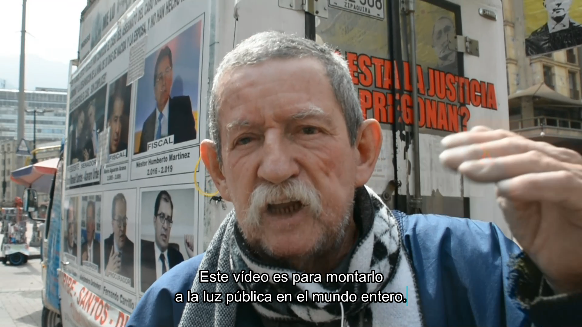 Allí llegaba todas las mañanas a las 9:00 am, sin falta, y no se iba hasta bien entrada la tarde. Su ritual comenzaba cuando aparcaba el furgón, bajaba, abría las puertas traseras para sacar cuerdas y fotografías. Amarraba los cabos a un semáforo y una señal de tránsito para luego colgar diferentes recortes de periódico de sus viajes por Colombia en busca de la verdad.