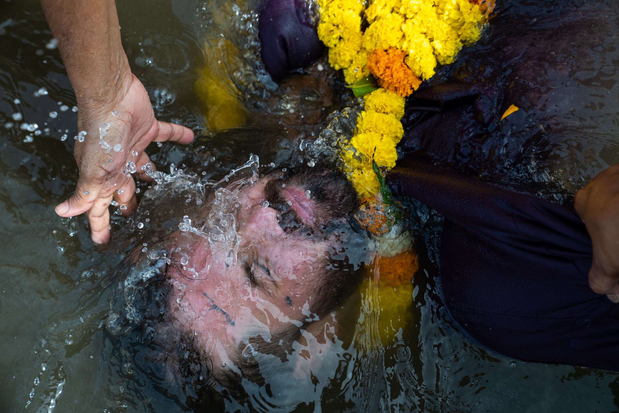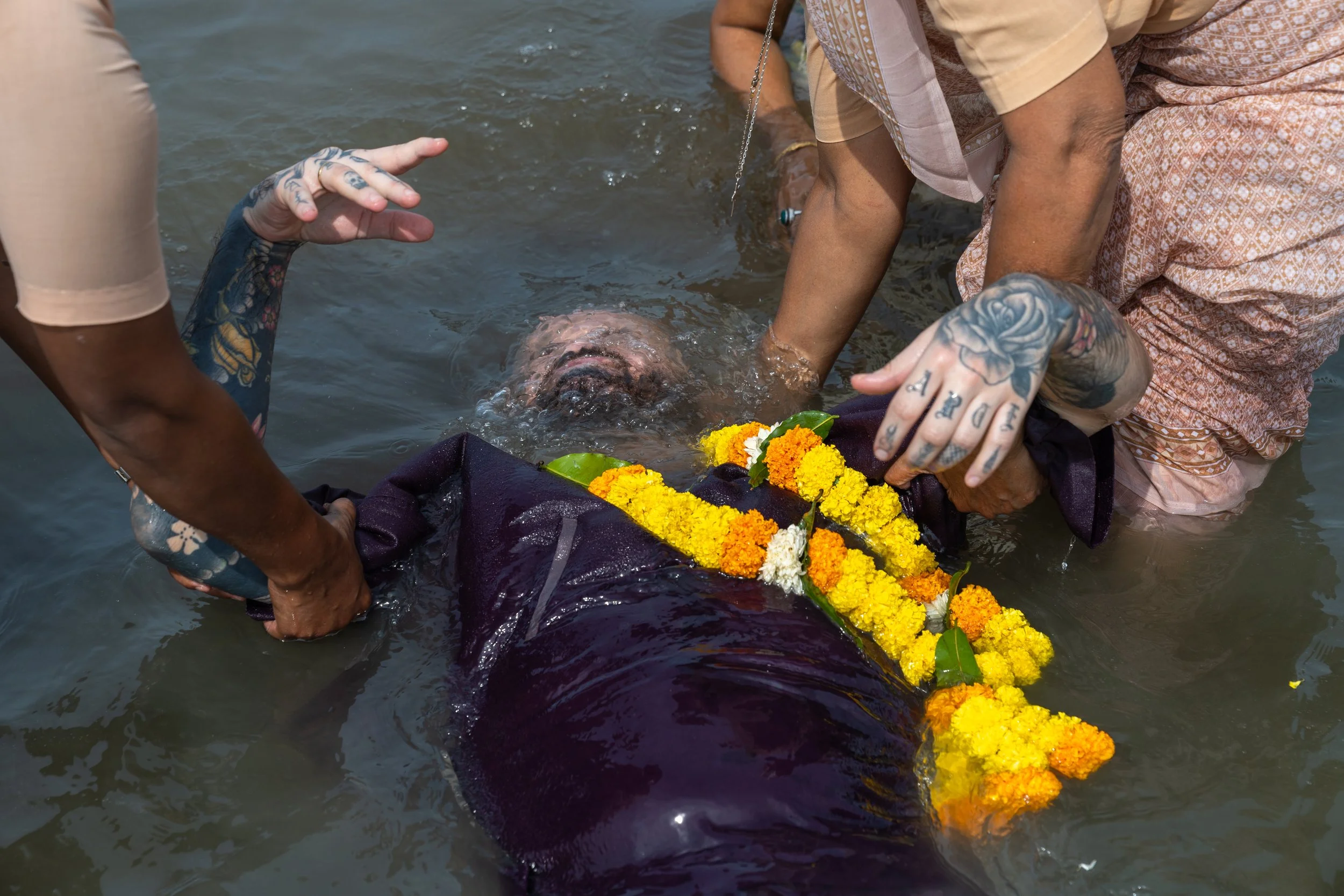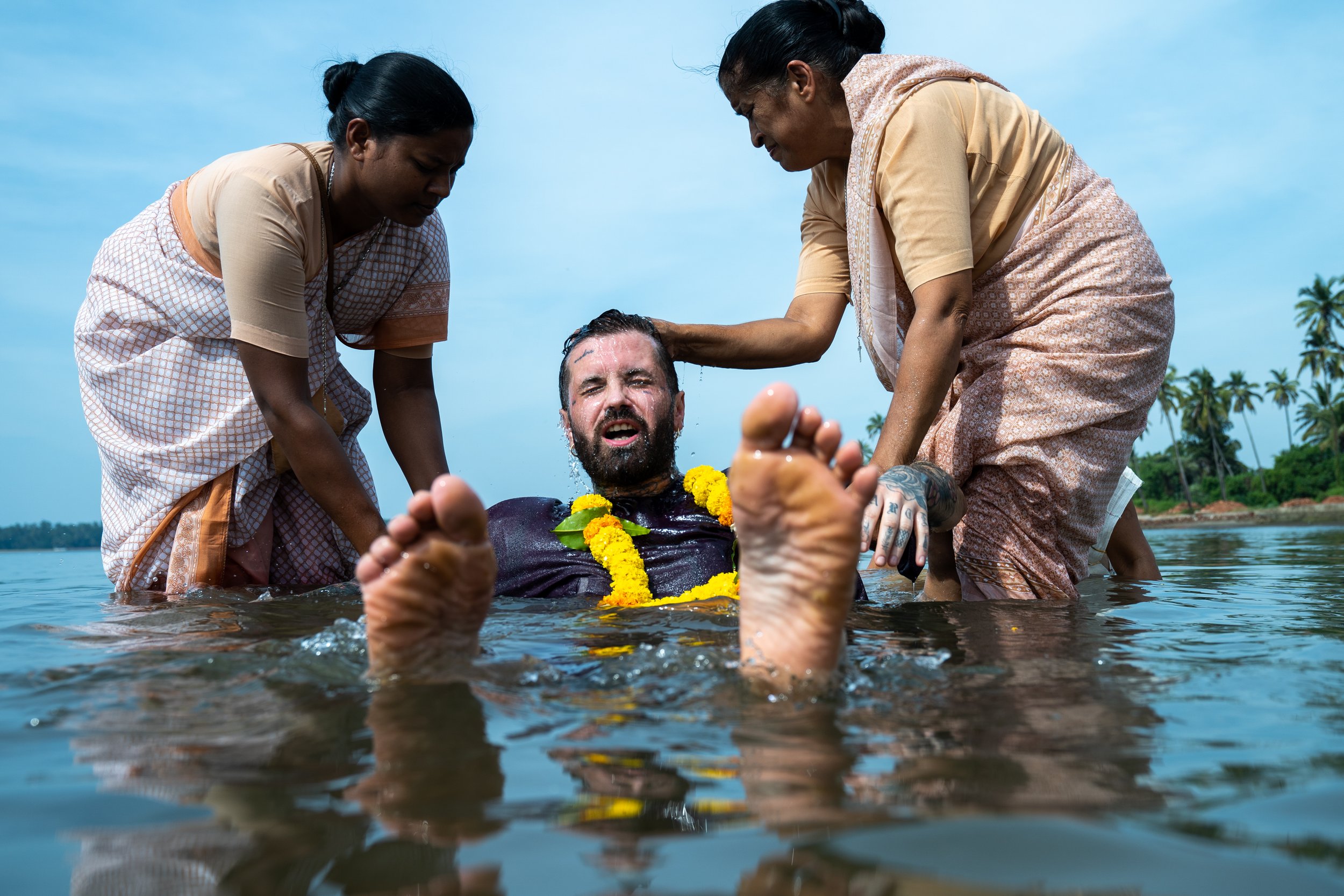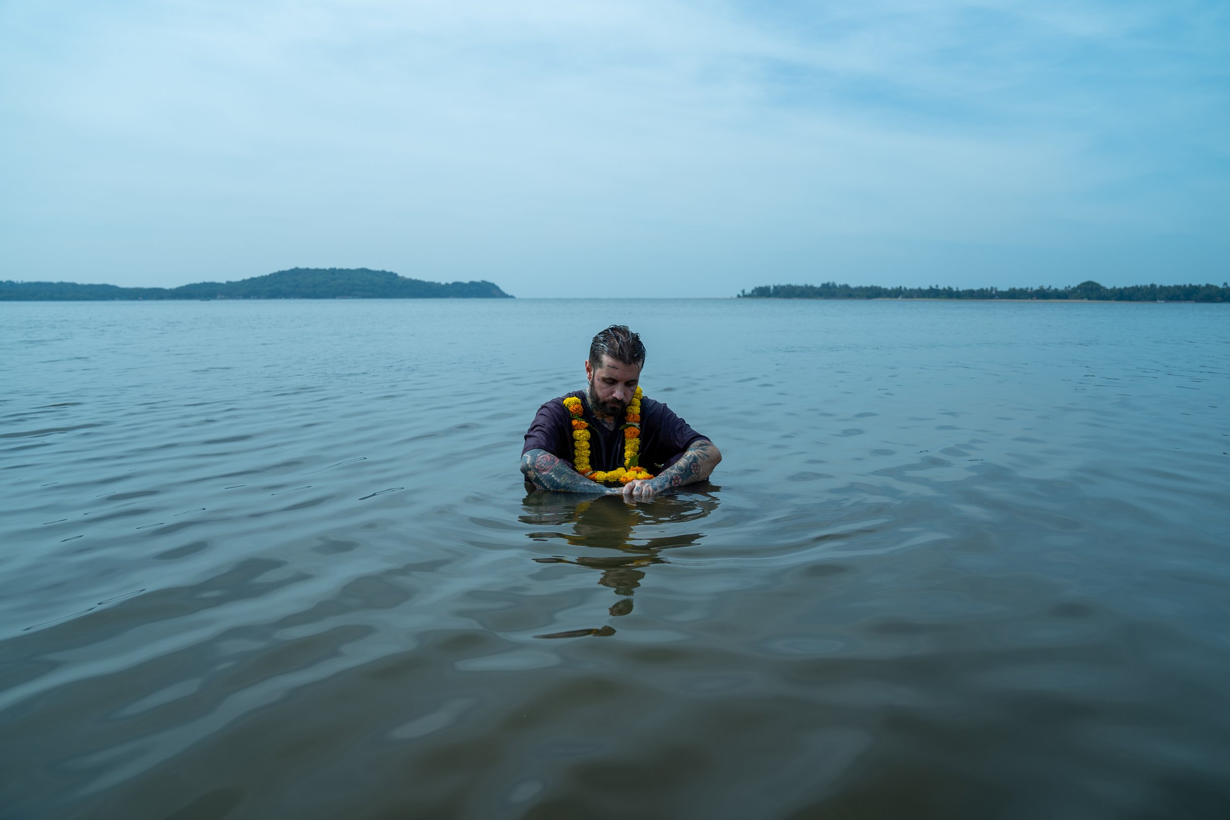 Abel Azcona tras realizar las performance más íntimas y extremas, en torno a la madre y la idea biográfica, en la retrospectiva dedicada al artista en su país de origen llega a la India. Durante varios días realizará varios proyectos performativos sobre el abandono y las violencias en Orfanatos locales. La primera obra de performance que realizará en el Río Uddo será un lavatorio junto a dos madres espirituales indias. Dos mujeres fuertes, pescadoras, mujeres del rio que acompañaran y lavaran al artista antes de empezar el resto de su viaje artístico en Goa. Una pieza que habla de conexión materna, nuevas madres y vínculos con la tierra y el lugar.