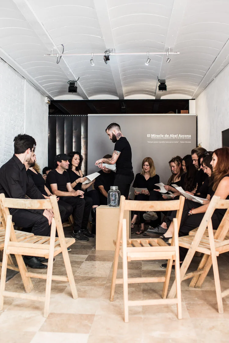 “In”El Miracle”, Abel Azcona proposed an introspective and almost initiatory journey, through a collective performance on the paths of freedom. The search for which leads millions of people, who have lost almost everything, to endanger the only thing they have left, their lives. To walk towards new horizons they hope will be kinder than those left behind.