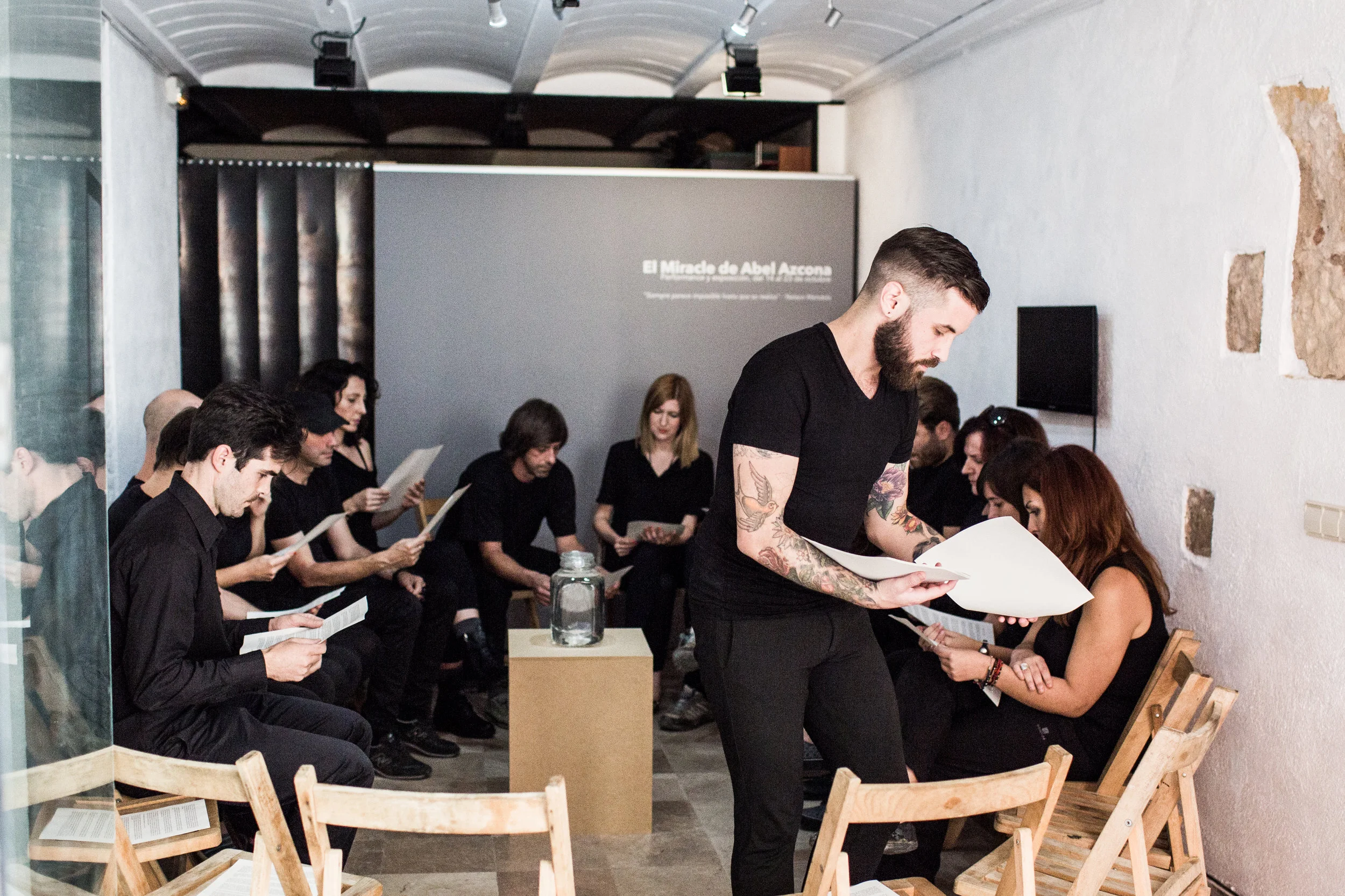“En “El Miracle”, Abel Azcona nos propuso un viaje introspectivo, y casi iniciático, a través de una performance colectiva por los caminos de la libertad. La búsqueda de los cuales lleva a millones de personas, que tienen casi todo perdido, a poner en peligro lo único que les queda, sus vidas. Caminar hacia nuevos horizontes que esperan sean más amables que los que dejaron atrás.
