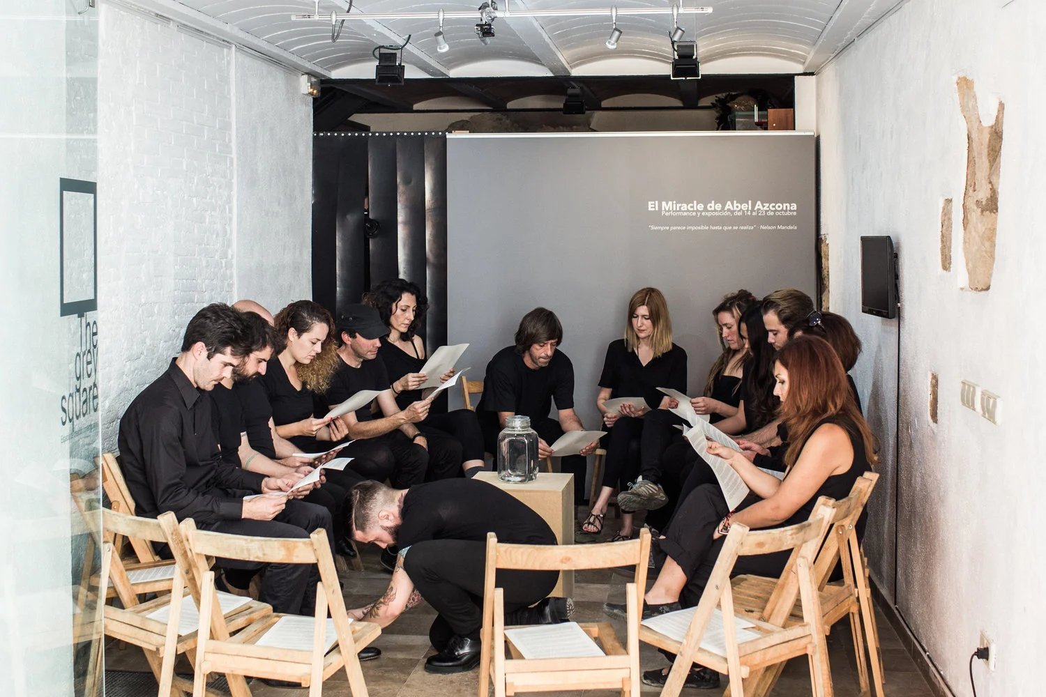 Pero, “El Miracle” de Abel Azcona, va un poco más allá. Nos hizo pensar, que la mayoría de nosotros también hemos caminado buscando, en algún momento de nuestra vida, una permutación, una palabra, un recibimiento amable cuando hemos cambiado la orientación de nuestras expectativas. Los participantes de la performance realizaron con el artista un recorrido que comenzó en The Grey Square, hasta la playa del Miracle en la ciudad de Tarragona.”