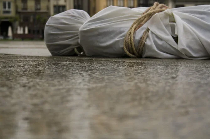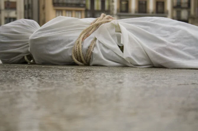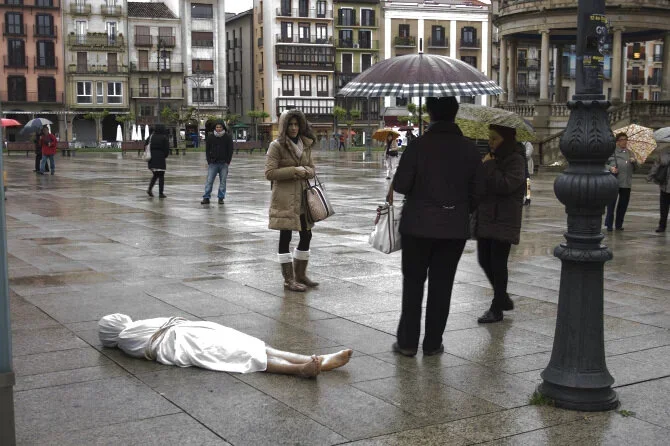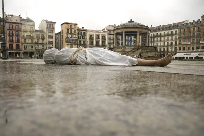 Abel Azcona, for three hours lied naked in the Plaza del Castillo in Pamplona. Wrapped in a white sheet, and tied with a rope, the artist seeks to denounce everything that is wrong in this conservative city. It denounces the hypocrisy of its thousands of inhabitants, who paradoxically profess and exalt a religion of love and at the same time stigmatize and segregate all those who do not meet the traditional parameters of normal. The interest of the performance consists in making evident what is there, in the sight of anyone who carefully analyzes it, but which all refuse to see; it consists in showing how we are silenced by social and institutional surveillance mechanisms and how we are being disciplined by a political and economic system that forces us to be immobile, naked and makes us feel fragile.