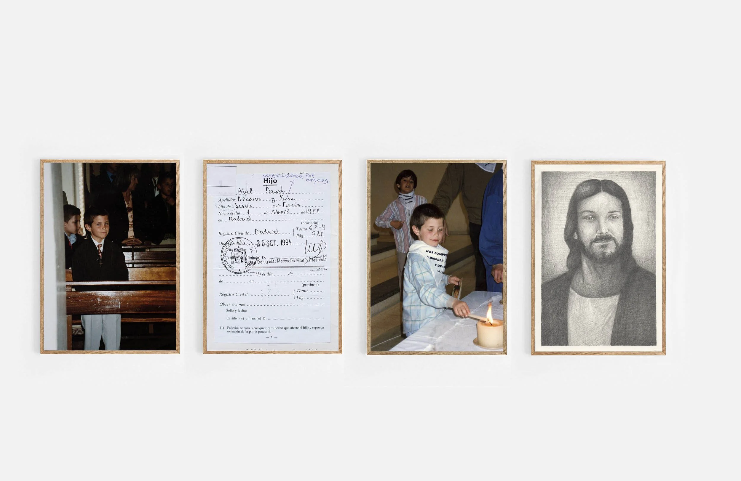 Jesús y María es una obra objeto de Abel Azcona creada a partir de tres procesos claramente diferenciados: La búsqueda del expediente de adopción donde el artista consiguió decenas de documentos y las primeras partidas de nacimiento y registro que habían sido suprimidas y retiradas del registro civil, donde finalmente consigue uno de los registros oficiales donde es registrado como hijo de Jesús y de María evidenciado la gran herencia católica de las instituciones. Una evidencia más de la denuncia permanentemente del creador de su derecho a no haber nacido, defendiendo las tres ocasiones en las que su madre intentó interrumpir el embarazo comprendiendo el aborto como una de las mayores medidas de protección a la infancia que existen.